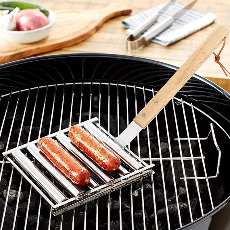 Hot Dog Roller Sausage Rack with Extra Long Wood Handle, BBQ Griller for Evenly Cooked Dogs