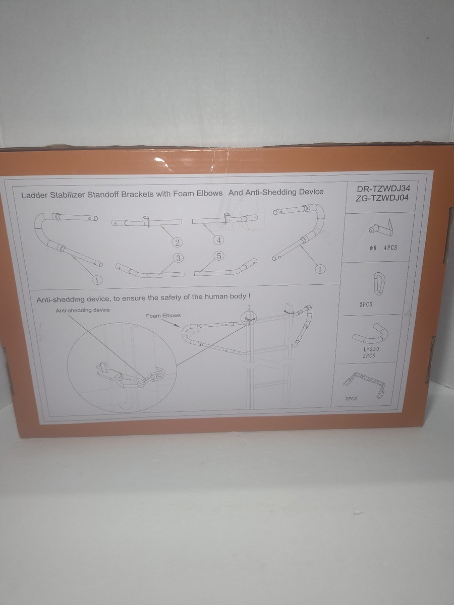 Brand new, factory sealed Delmoar Ladder Stabilizer / Ladder Standoff Brackets, designed to improve ladder safety by providing secure spacing from roofs, gutters, and walls.