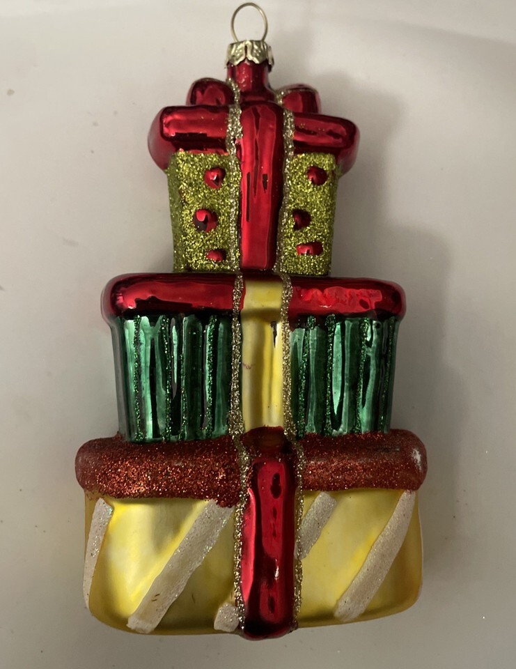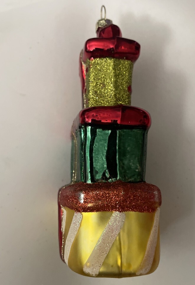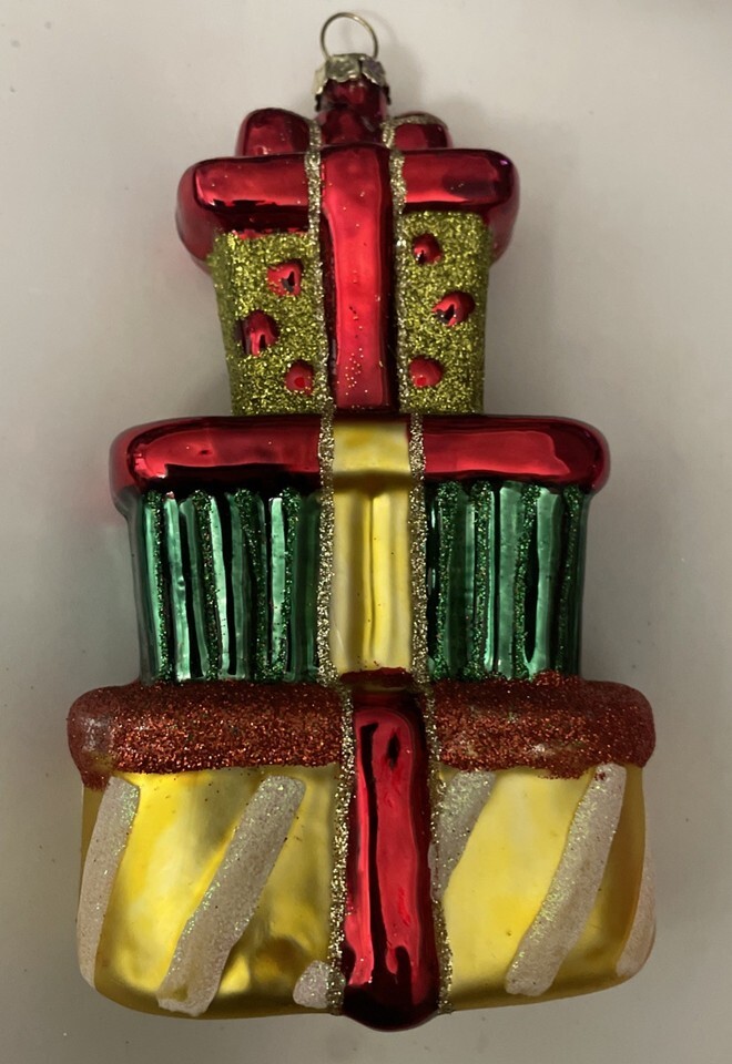 VTG Christopher Radko?Celebrations Stacked Presents Christmas Glass Ornament 6"