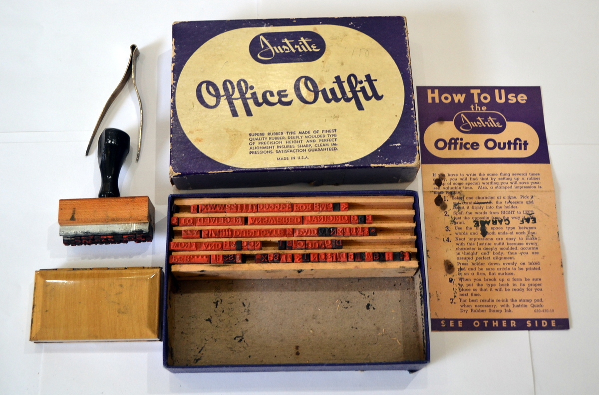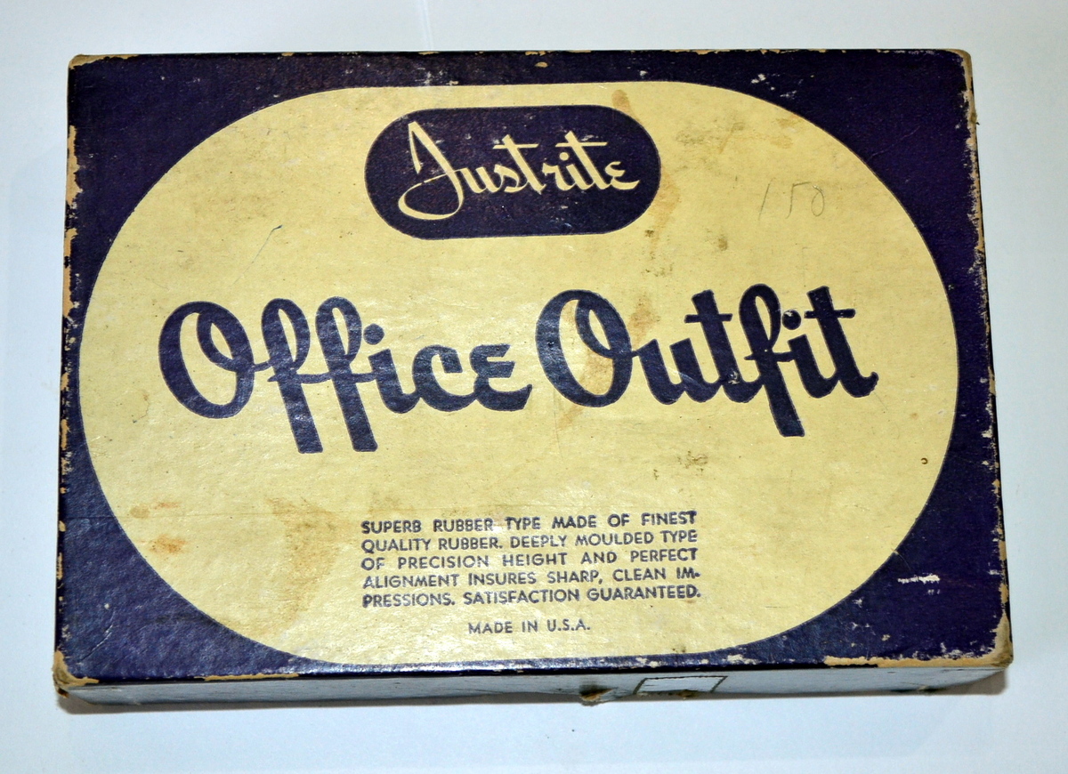 This listing is for one complete JustRite Rubber Stamp, “Office Outfit” set.