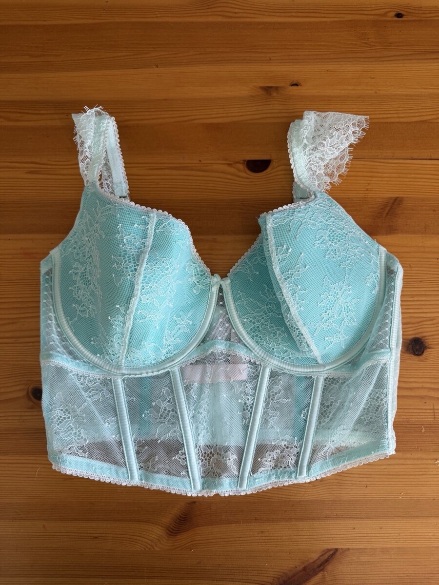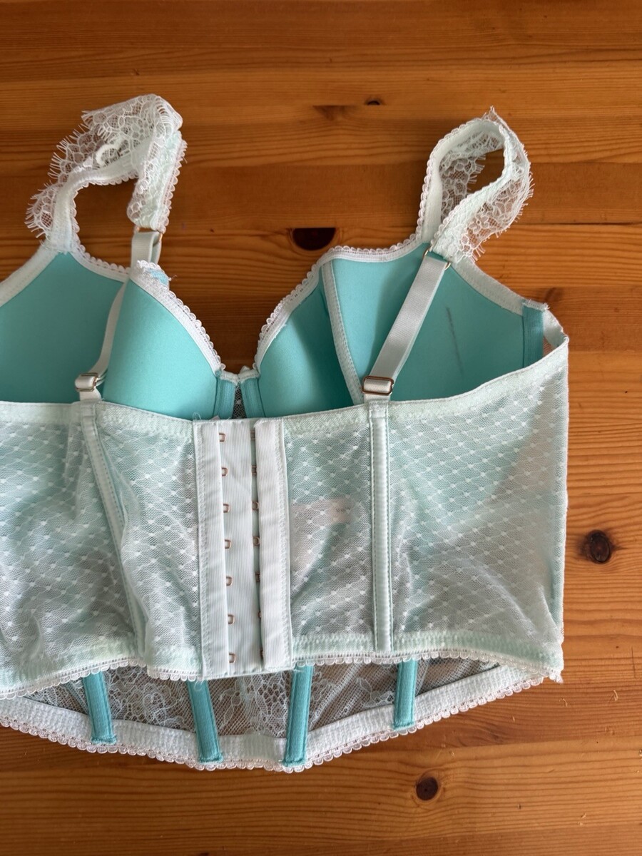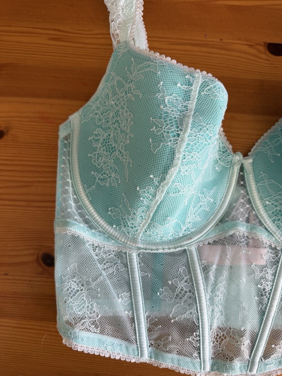 Victorias Secret Med-DD Long Line Balcónette Bra Thong Set Mint White Lace NWT