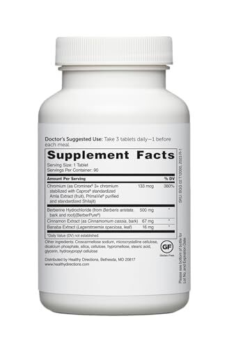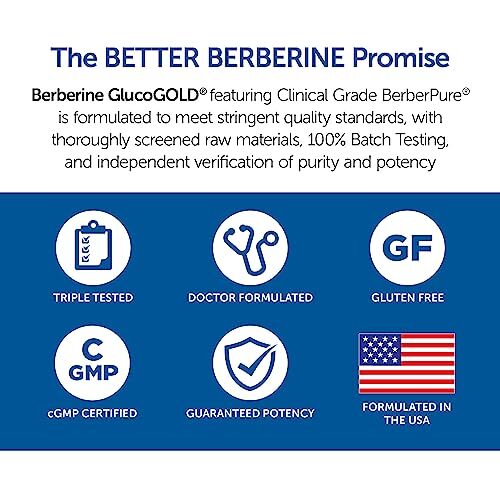THREE POWERHOUSE BOTANICALS: 1,500 mg BerberPure Berberine, 400 mcg Crominex 3 and 48 mg Banaba leaf extract. Plus, a highly concentrated cinnamon extract FULL 1,500 MG RESEARCH DAILY DOSE OF BERBERINE. With clinically validated BerberPure Berberine Hydrochloride used in clinical practice, which means you get the dosage and form backed by human clinical data. THE EASY-SWALLOW CLEAR-COAT TABLETS IN BERBERINE GLUCOGOLD ARE FREE OF unnecessary colorants, reflecting the natural color of the ingredients. DEVELOPED BY JULIAN WHITAKER, MD, PIONEER OF ALTERNATIVE MEDICINE, and the Whitaker Nutrition research team. Distributed by Healthy Directions, known for its stringent quality control measures and Triple Testing Philosophy that have led to a top-notch safety record for more than 25 years THE HEALTHY DIRECTIONS DIFFERENCE: Helping people live healthier, more active lives for over 30 years through innovative and exclusive doctor-backed formulas, superior quality standards, clinically validated key ingredients and results, and commitment to excellence.