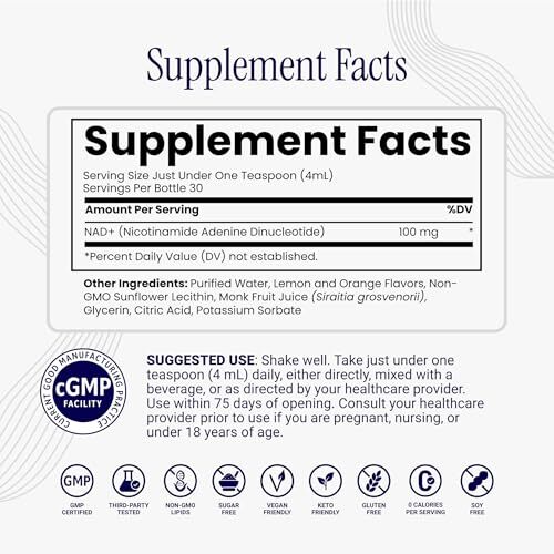 PREMIUM DOCTOR-FORMULATED NAD : This liquid liposomal NAD (Nicotinamide Adenine Dinucleotide) supplement is designed to help support normal cellular health.* NAD plays an important role in supporting ATP energy processes and normal cellular functions involved in cellular maintenance, metabolic health, and healthy aging.* SUPPORTS HEALTHY AGING ENERGY:NAD is found in every living cell and helps support normal energy metabolism. It helps maintain healthy energy levels by supporting the conversion of nutrients into energy and contributes to mitochondrial efficiency, which may help support healthy aging and vitality.* SUPPORTS CELLULAR HEALTH: NAD helps maintain normal cellular processes that contribute to healthy cellular function over time, including supporting sirtuin activity and cellular stress response, which together help support overall cell health.* LIPOSOMAL DELIVERY FOR ABSORPTION: Our liposomal technology is designed to help support absorption by encapsulating NAD in tiny phospholipid spheres, helping protect the nutrient through the digestive process.* CONVENIENT LIQUID FORM: Light, fresh lemon essence flavor. Vegan, sugar free, keto-friendly, non-GMO, gluten, dairy, and soy free. Manufactured in the USA using thoughtfully selected worldwide ingredients in a GMP-certified facility and third-party tested for purity, potency and safety.