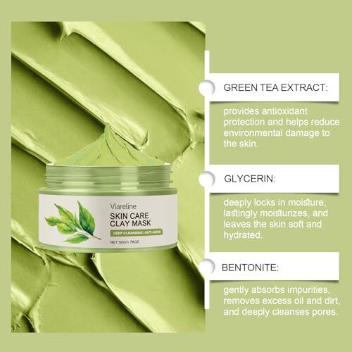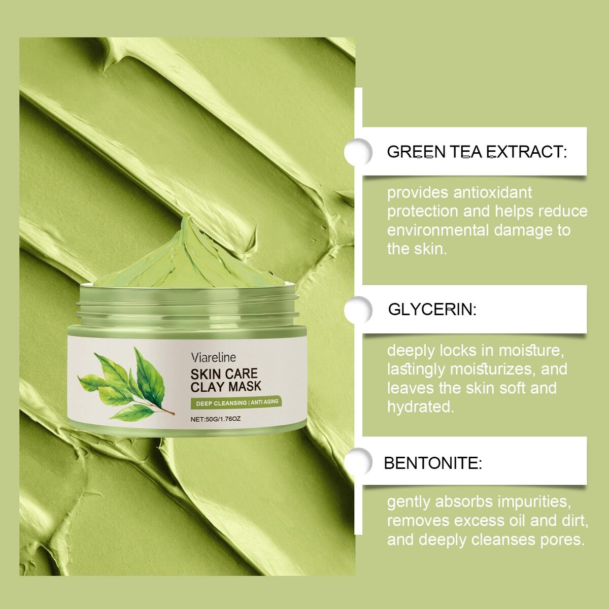 Viareline Matcha Green Tea Clay Mask, Clarifying & Hydrating Face Mask with Bent