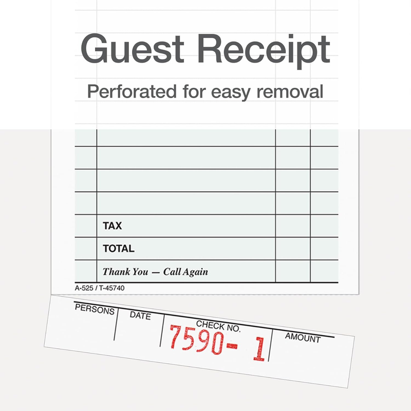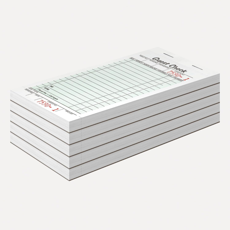 Single part guest checks printed on white tag, Dimensions - Book size: 3-2/5" x 6-3/4", Detached size: 3-2/5" x 6-1/4"