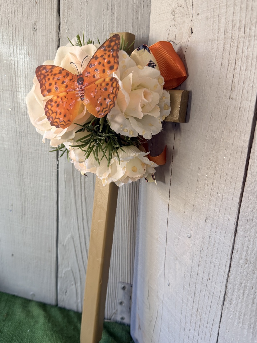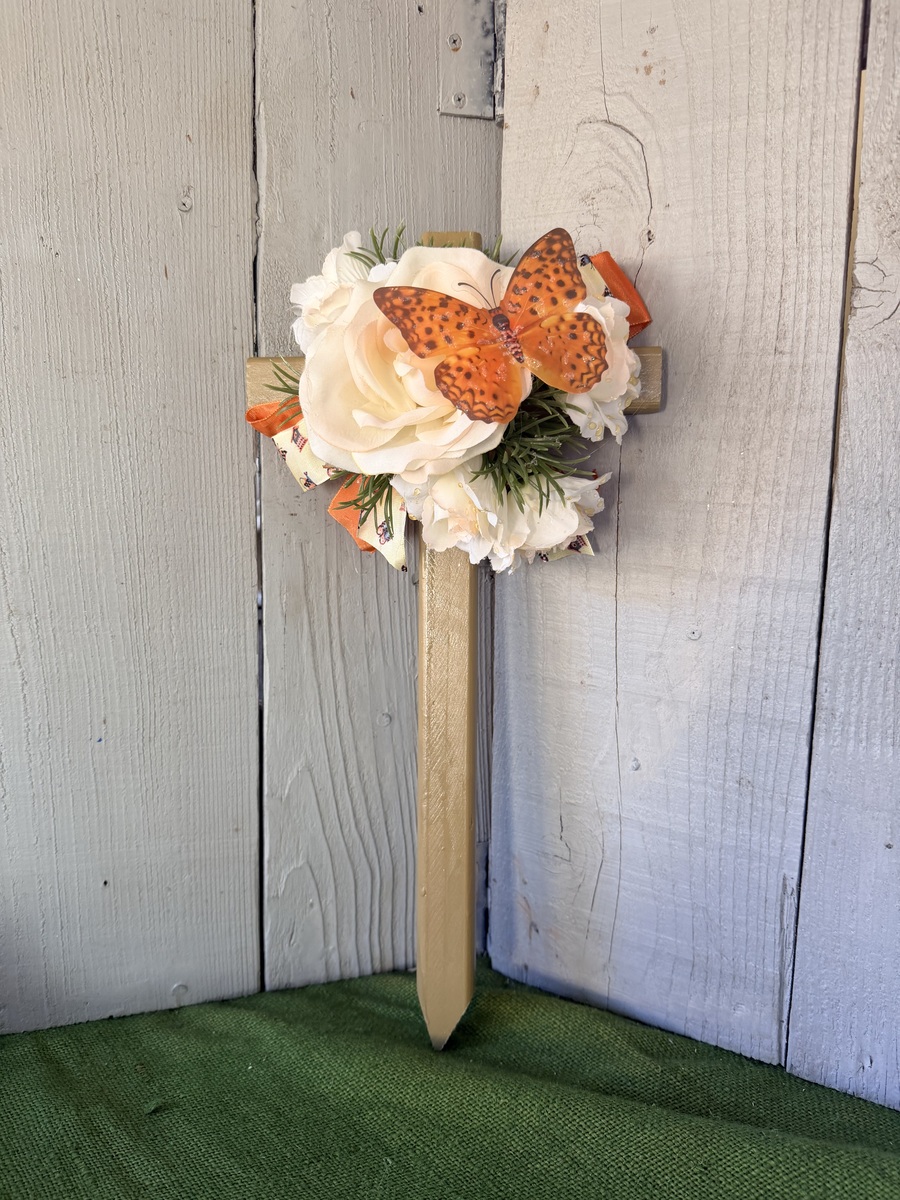 This 18” pine cemetery cross has been painted a light brown sugar color with a large pale yellow/pink rose centered, five rosebuds surrounding the center, greenery layered throughout, orange ribbon, an orange/gold butterfly attached to the front of roses, and butterfly ribbon. The cross has a pointed end for easy ground insertion. Every cross is sprayed with a coat of clear polyurethane to protect the ribbon and silk flowers from outdoor elements.