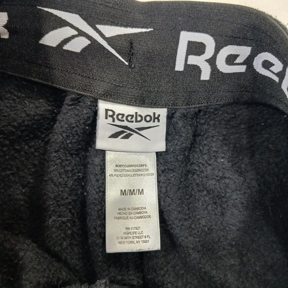 The Reebok Men's Black Drawstring Cotton Blend Jogger Sweatpants in size Medium (2928) are versatile activewear pants suitable for casual or athletic occasions. Made from a comfortable fleece fabric blend of polyester and cotton, these tapered leg jogger-style pants feature an elastic waist with a drawstring closure for a customized fit. With a classic black color, breathable material, and convenient pockets, these sweatpants offer both style and functionality for gym, training, running, or leisure activities in the fall, spring, or winter seasons. The Reebok brand ensures quality and comfort for the modern man on the go.