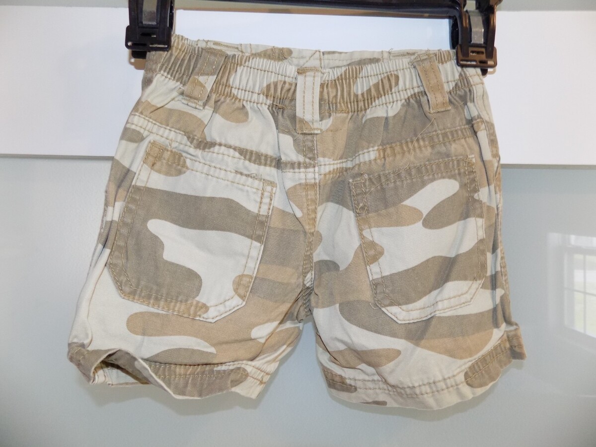 The product is a pair of Circo brown camouflage shorts in size 9 months for infants. Made of 100% cotton, these cargo style shorts feature an elastic waist for comfort and flexibility. The multicolor camouflage pattern adds a trendy touch to the design, making them a stylish addition to any little boy's wardrobe. Perfect for active infants on the go, these shorts are both practical and fashionable for everyday wear.