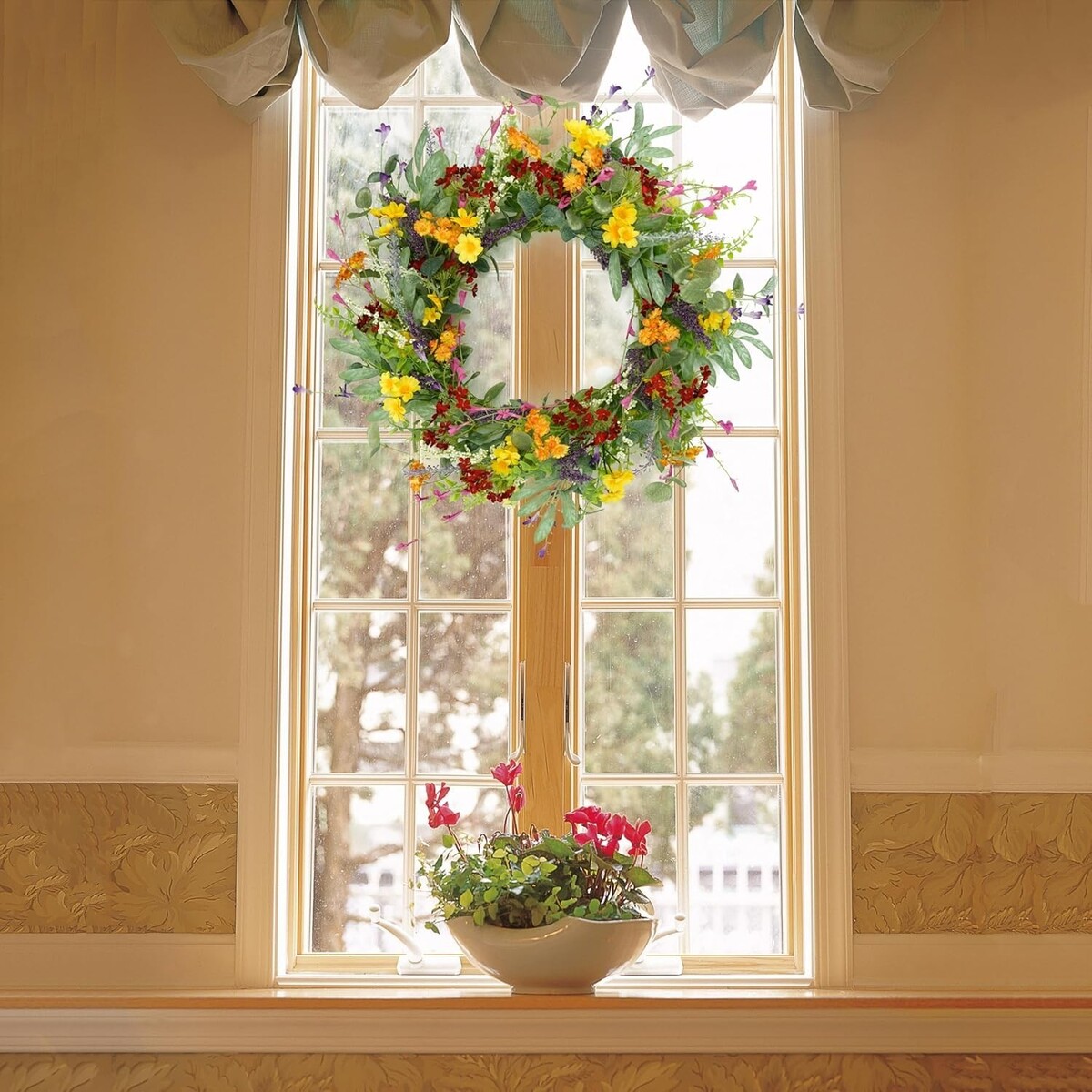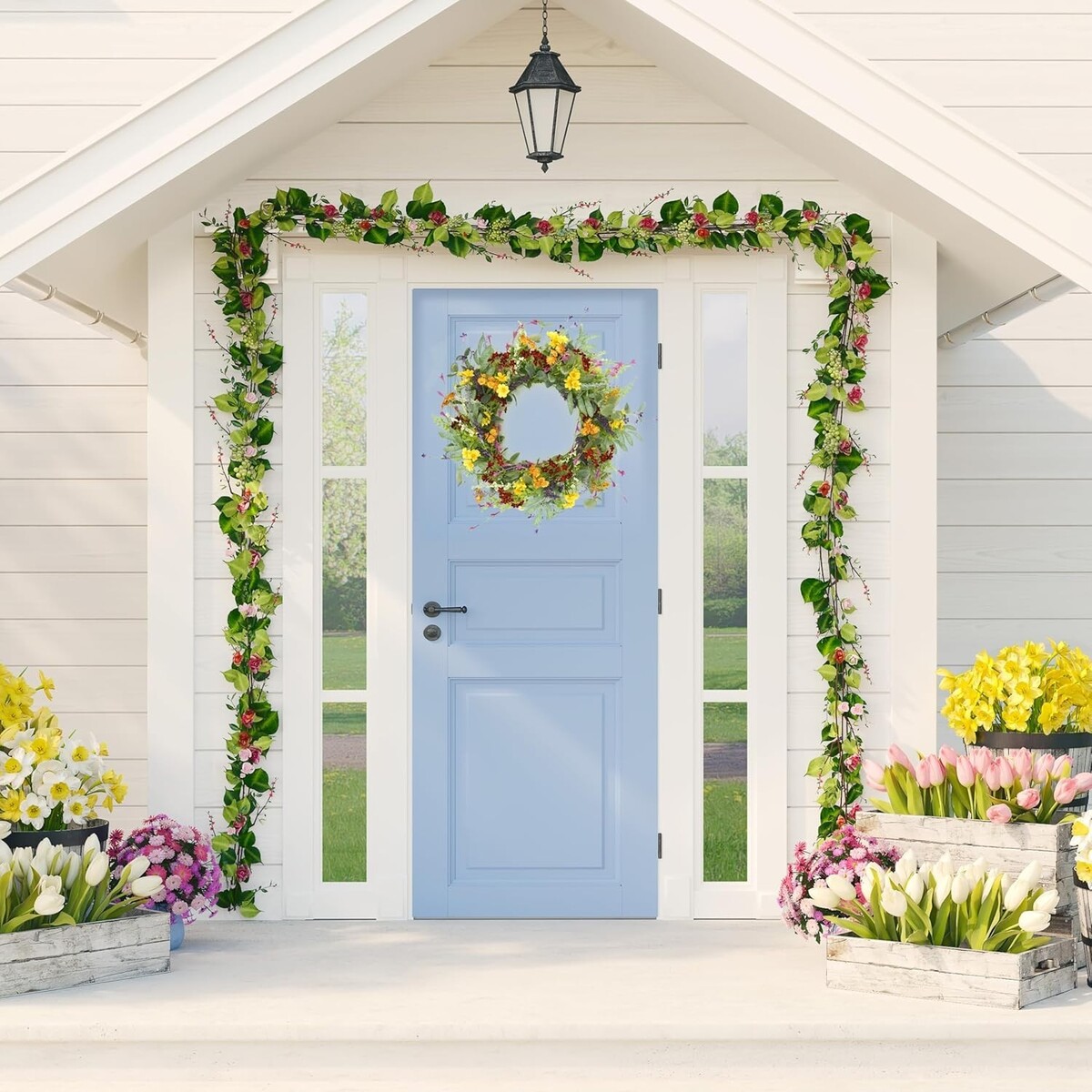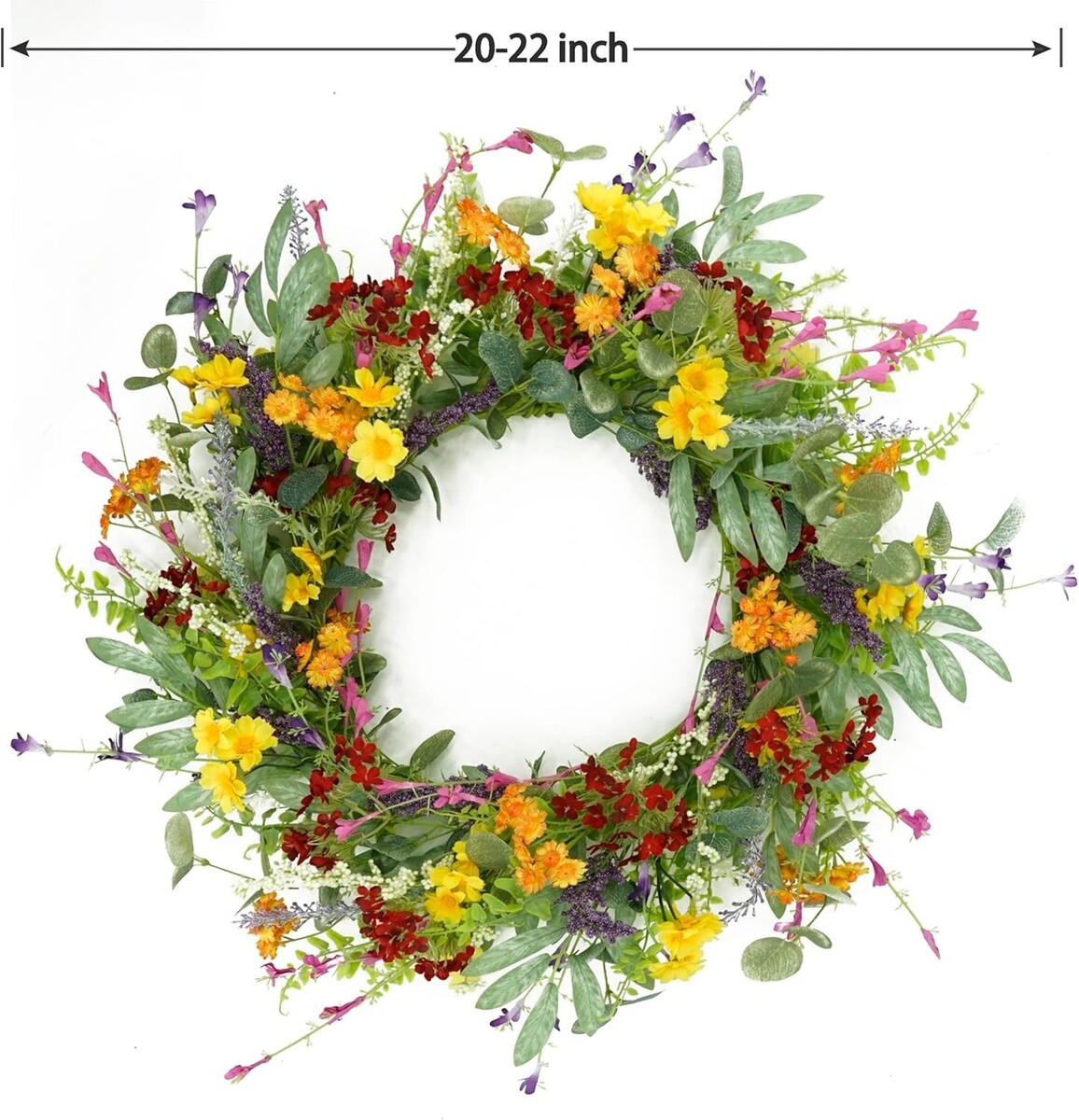 Beautiful Multi-Season Decor: Embellished with multicolor daisies, yellow daisies, lavender, olive leaves, eucalyptus leaves, and fern branches, adding charm to your spring and summer festivities.