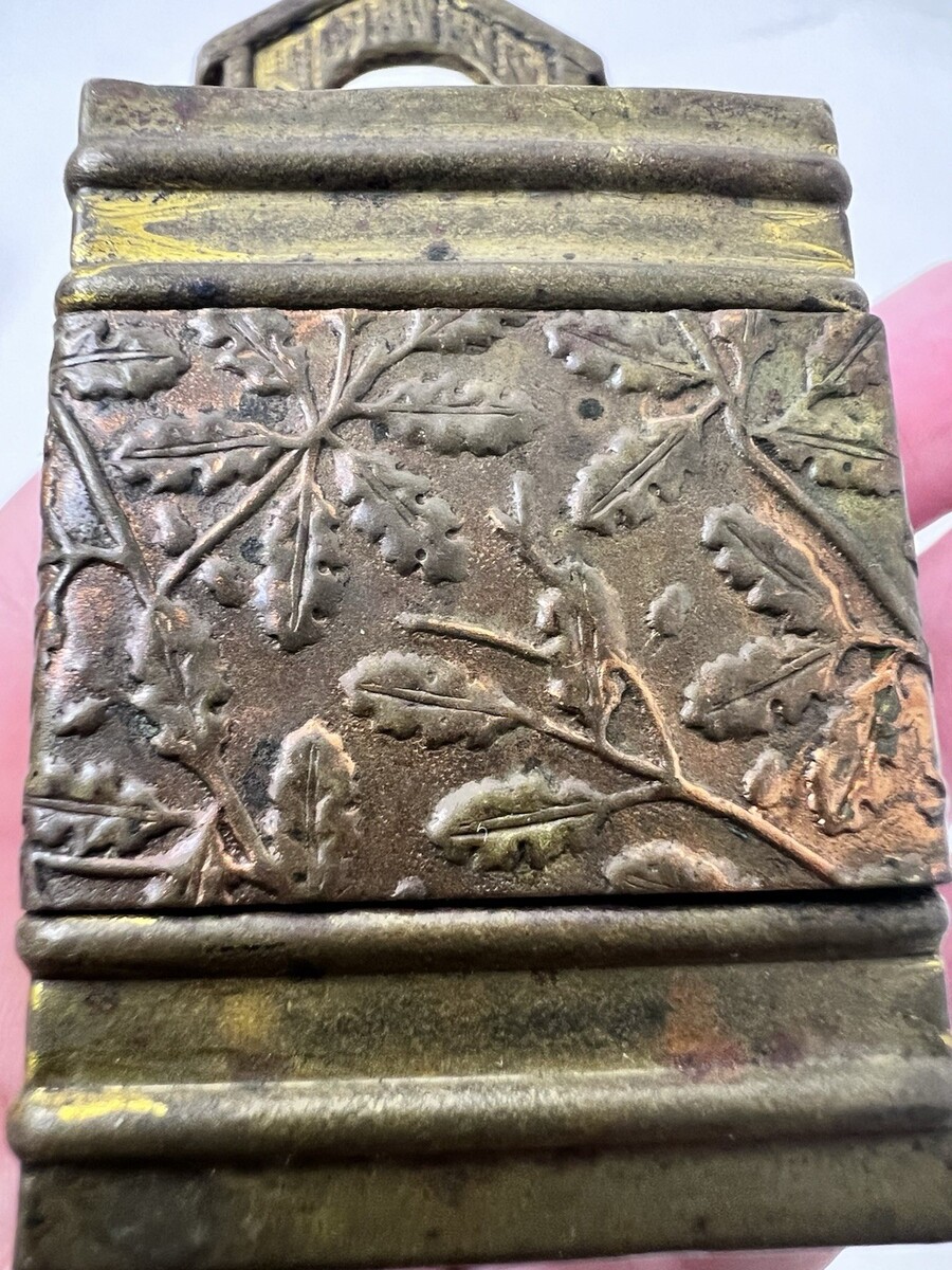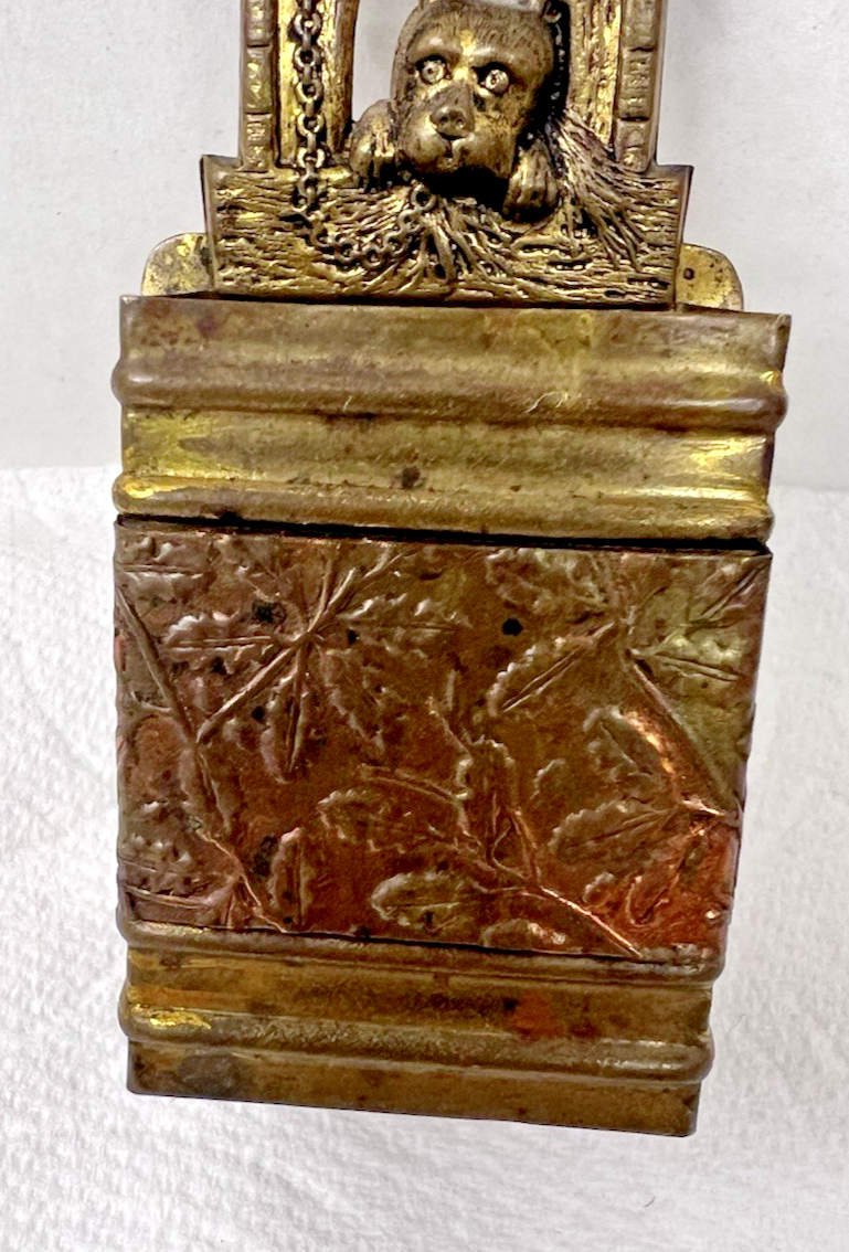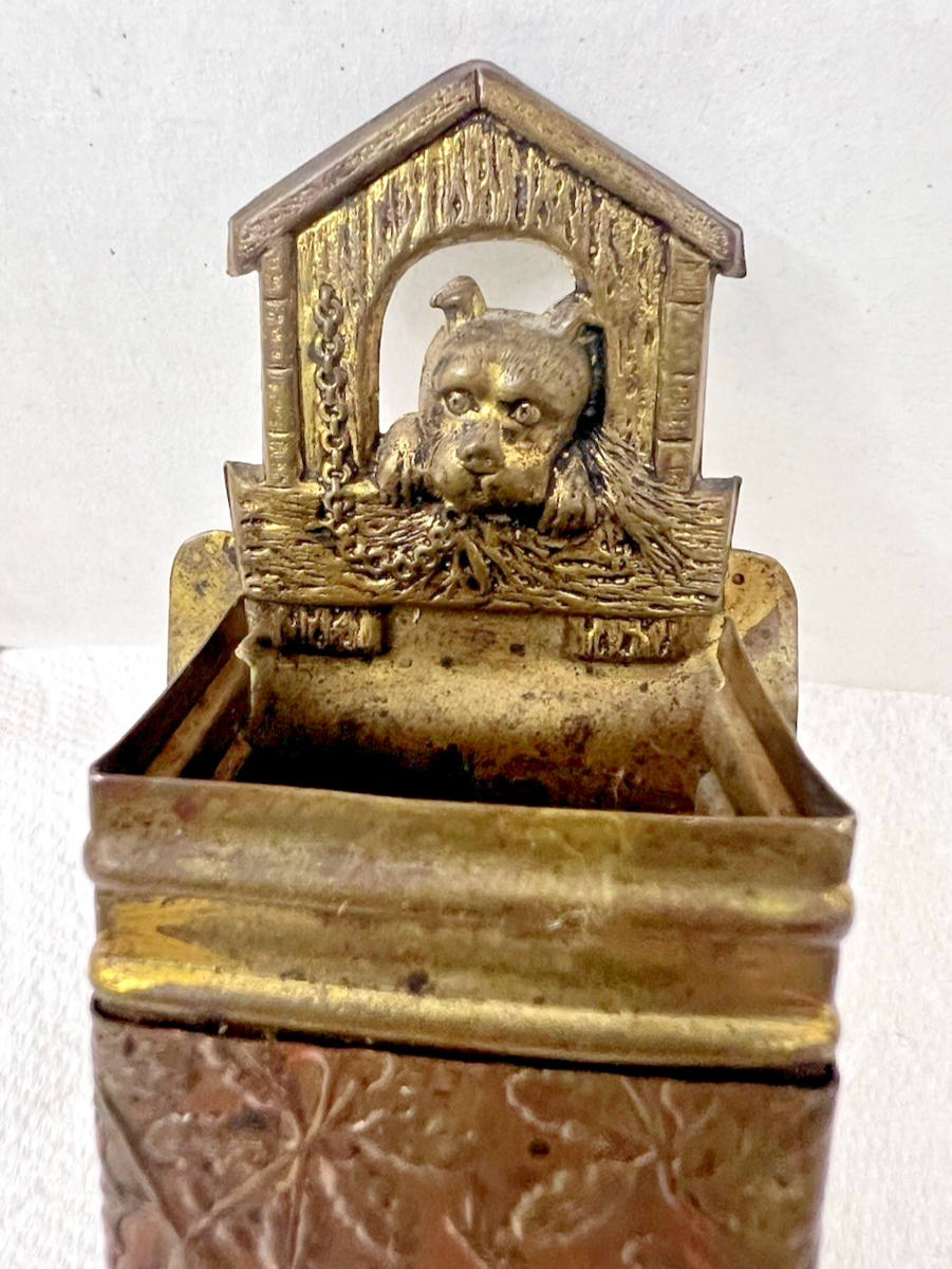 Vintage Pressed Brass Dog on House Match Holder w Floral Band 3 3/8 x 1 3/4