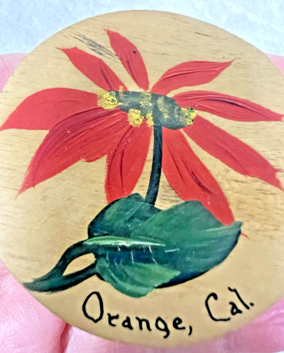 Antique Hand Painted Pincushion Souvenir Orange California Poinsettia Wood 2 inch round 5/8 inches thick