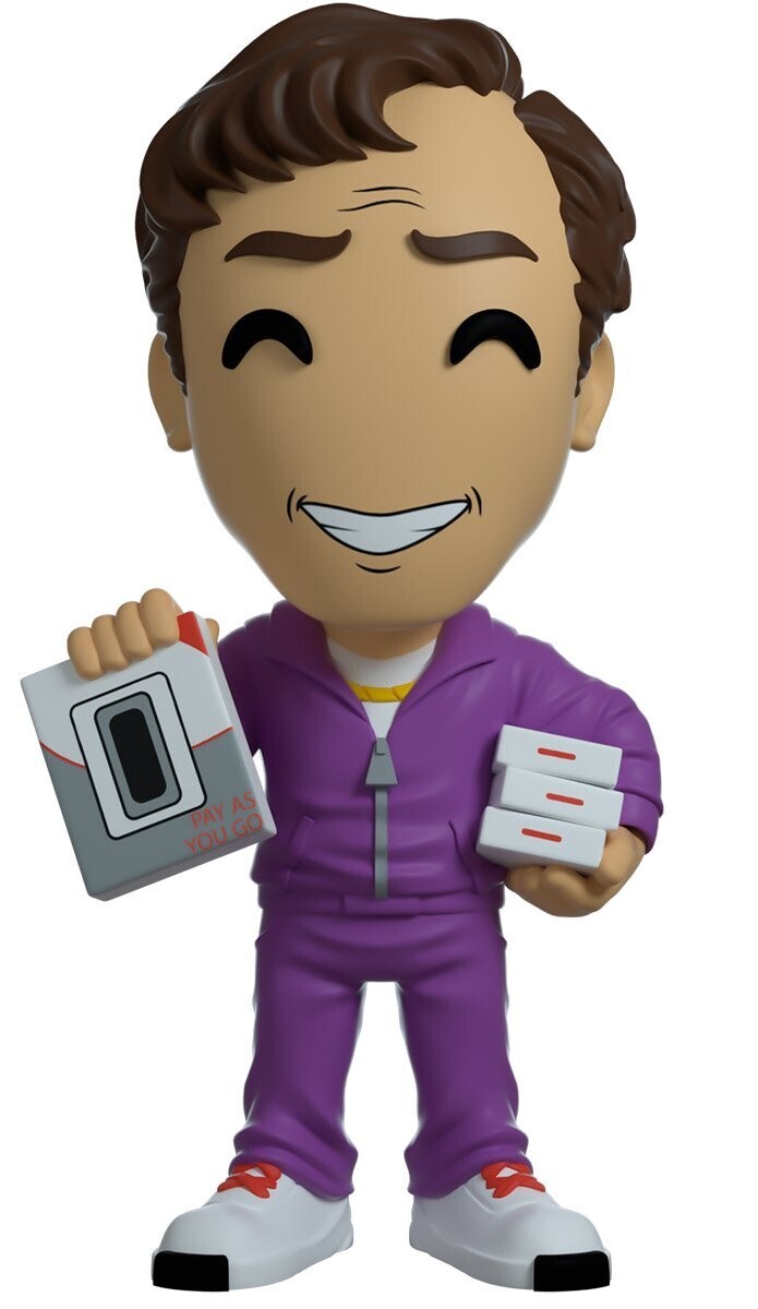 Standing at 4.9 inches, Slippin' Jimmy is here! With his hair sculpted in a slick side part, Jimmy looks at you with a sly smile on his face. He is dressed in a matching purple tracksuit with a gold chain necklace peaking out through his jacket. There is a white undershirt that matches with his white sneakers with red shoe laces. The exterior of his double-walled packaging shows a neighborhood with snow-packed sidewalks and money falling from the sky. The interior is a yellow background with the "Better Call Saul" logo printed in red and black. This collectible ships in a matte, embossed, protective outer sleeve and a custom sized plastic protector for maximum protection during shipping.