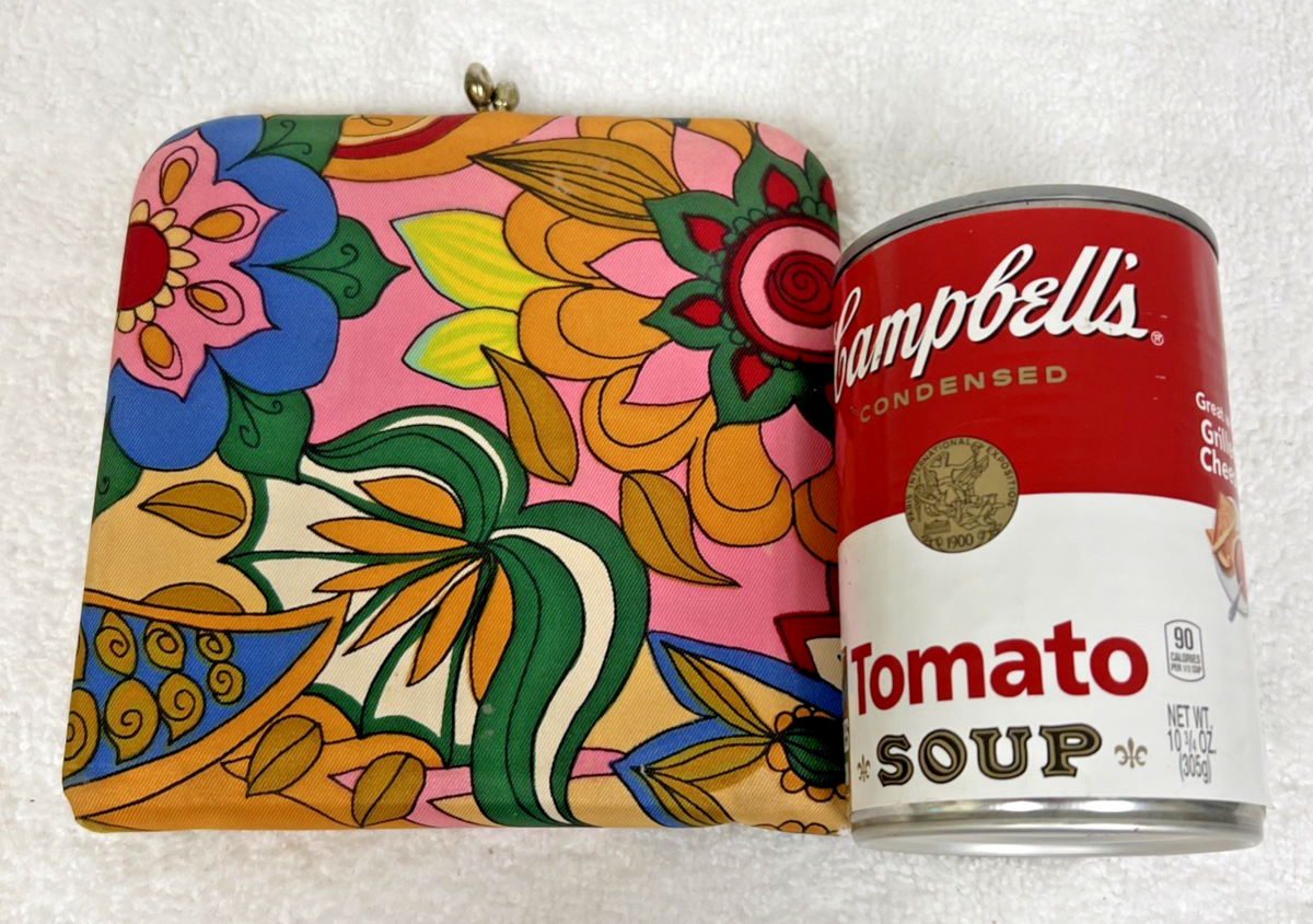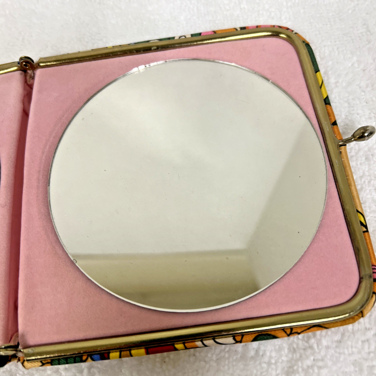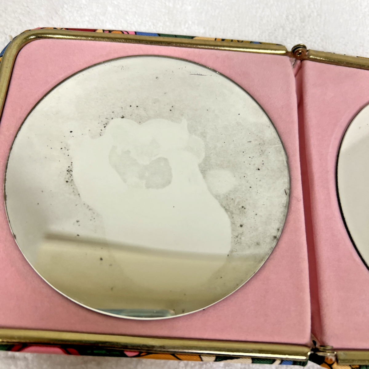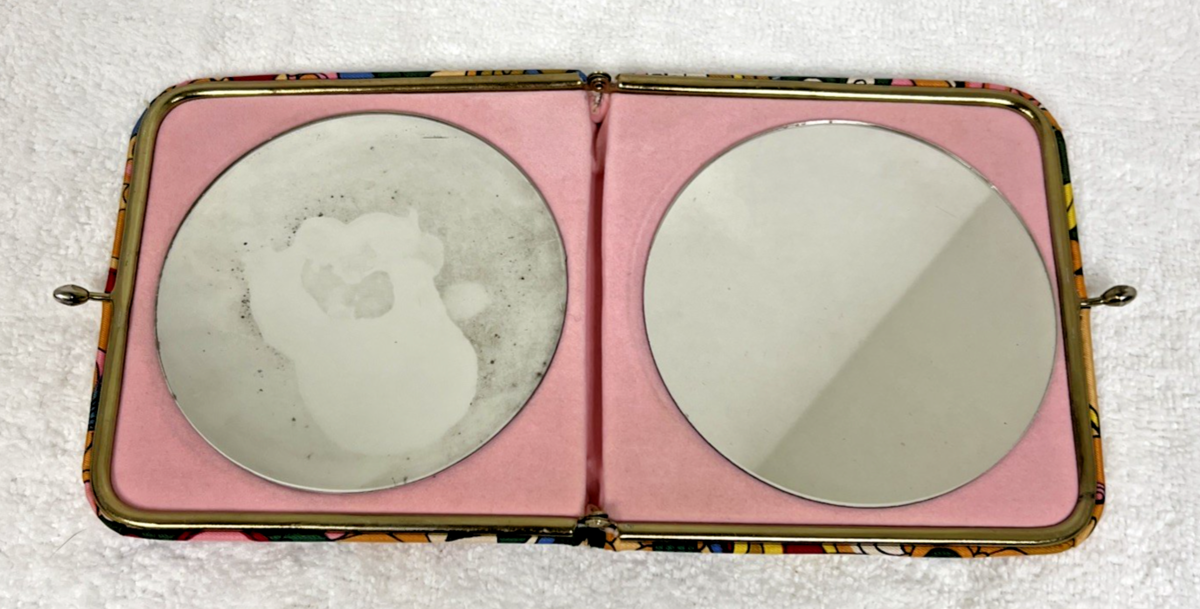 Vintage Retro Flower Power Large Floral Design Fabric Double Mirror Compact. Large double compact mirror fabric covering large bright color floral design, measures approx. 5 1/2" x 5 1/2", some marring to fabric one side and one bottom corner, one mirror has some wear to silvering. See pictures.