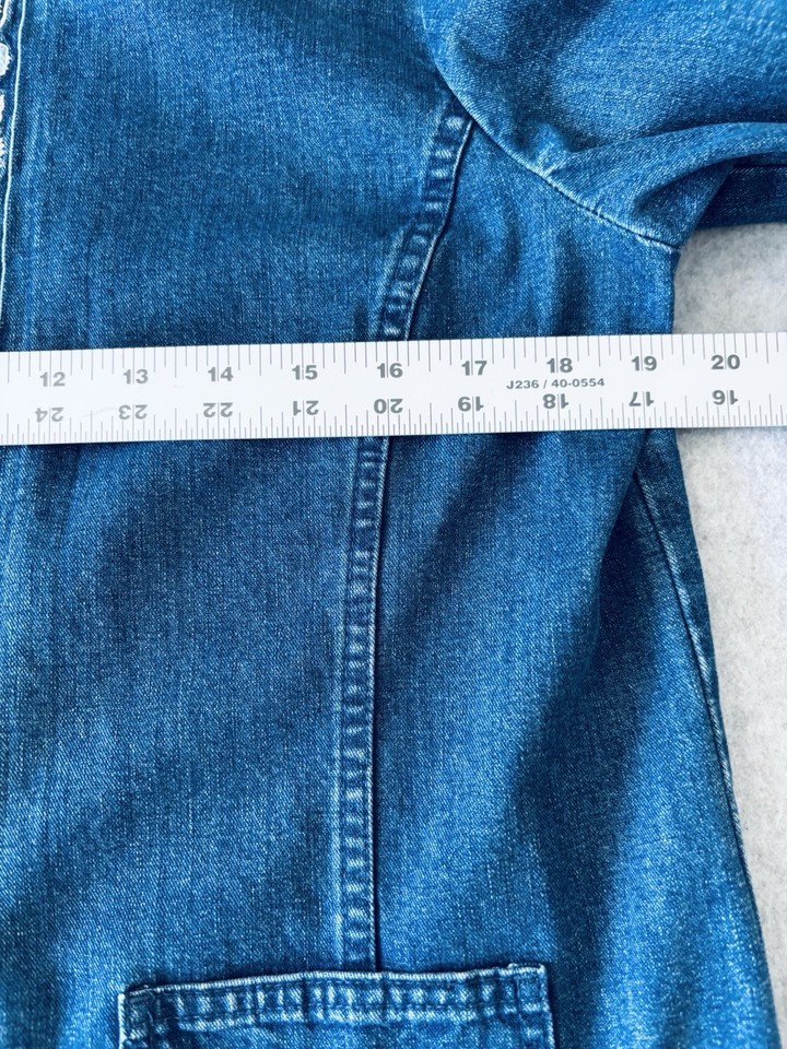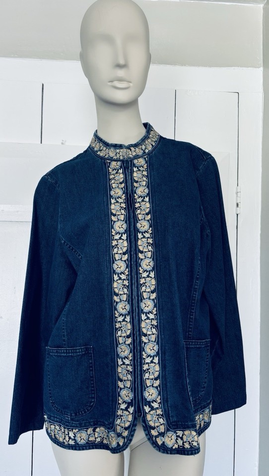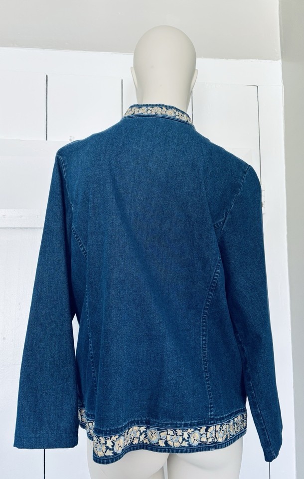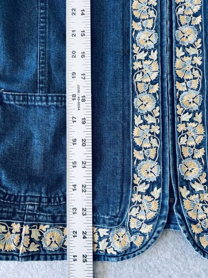 Orvis Womens Blue Jean Denim Yellow Floral Embroidered Jacket Coat Medium Retro