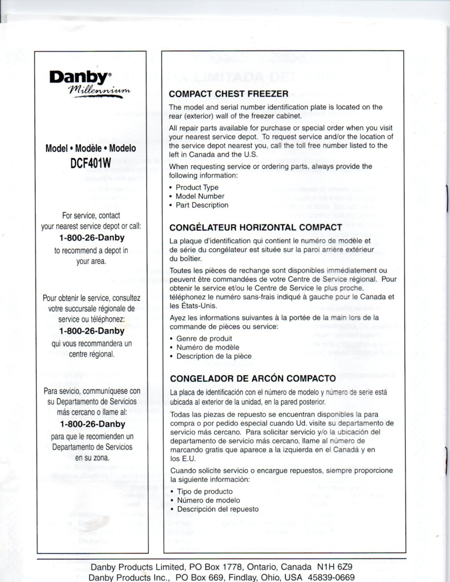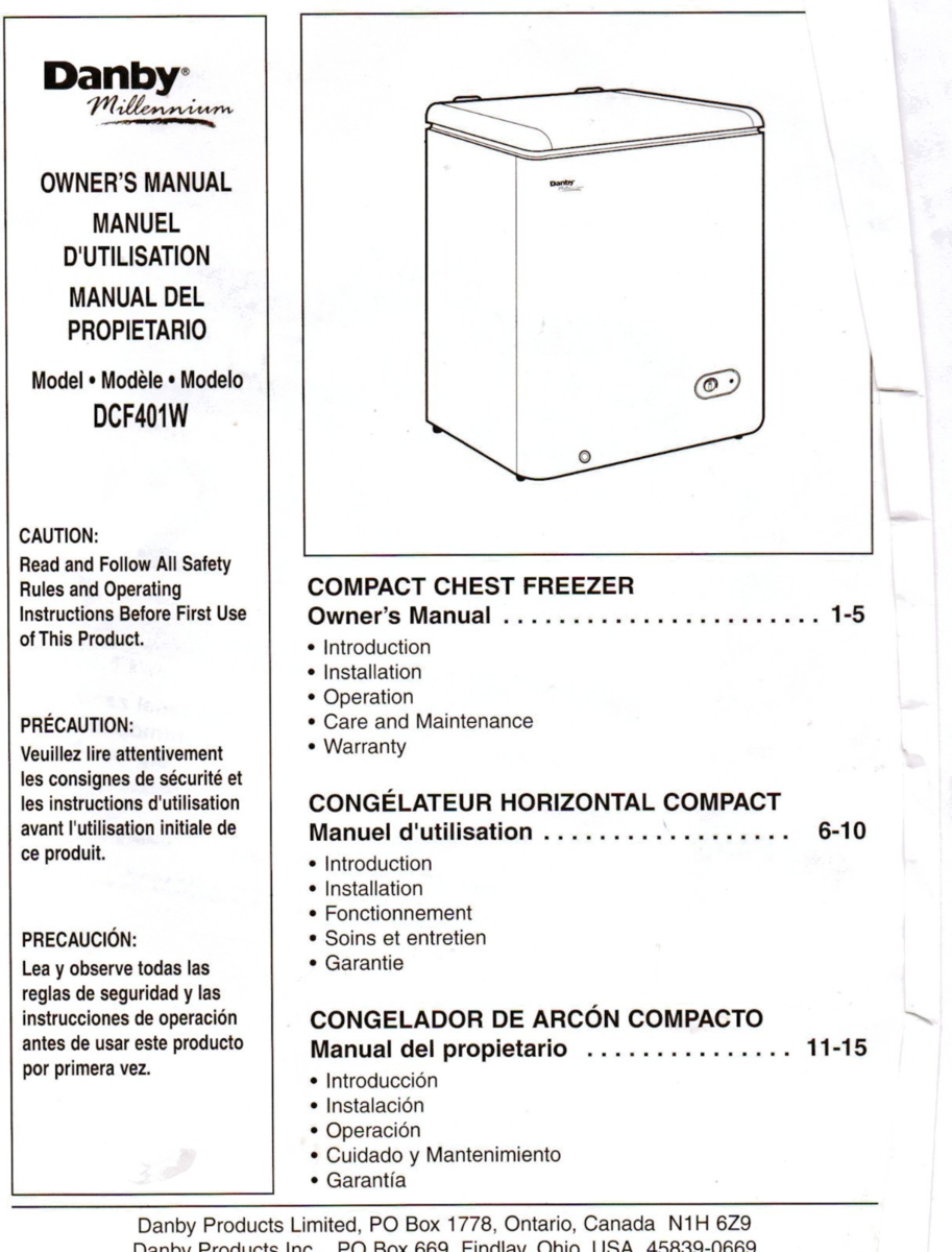 owner's manual for a Danby compact chest freezer, specifically model DCF401W.