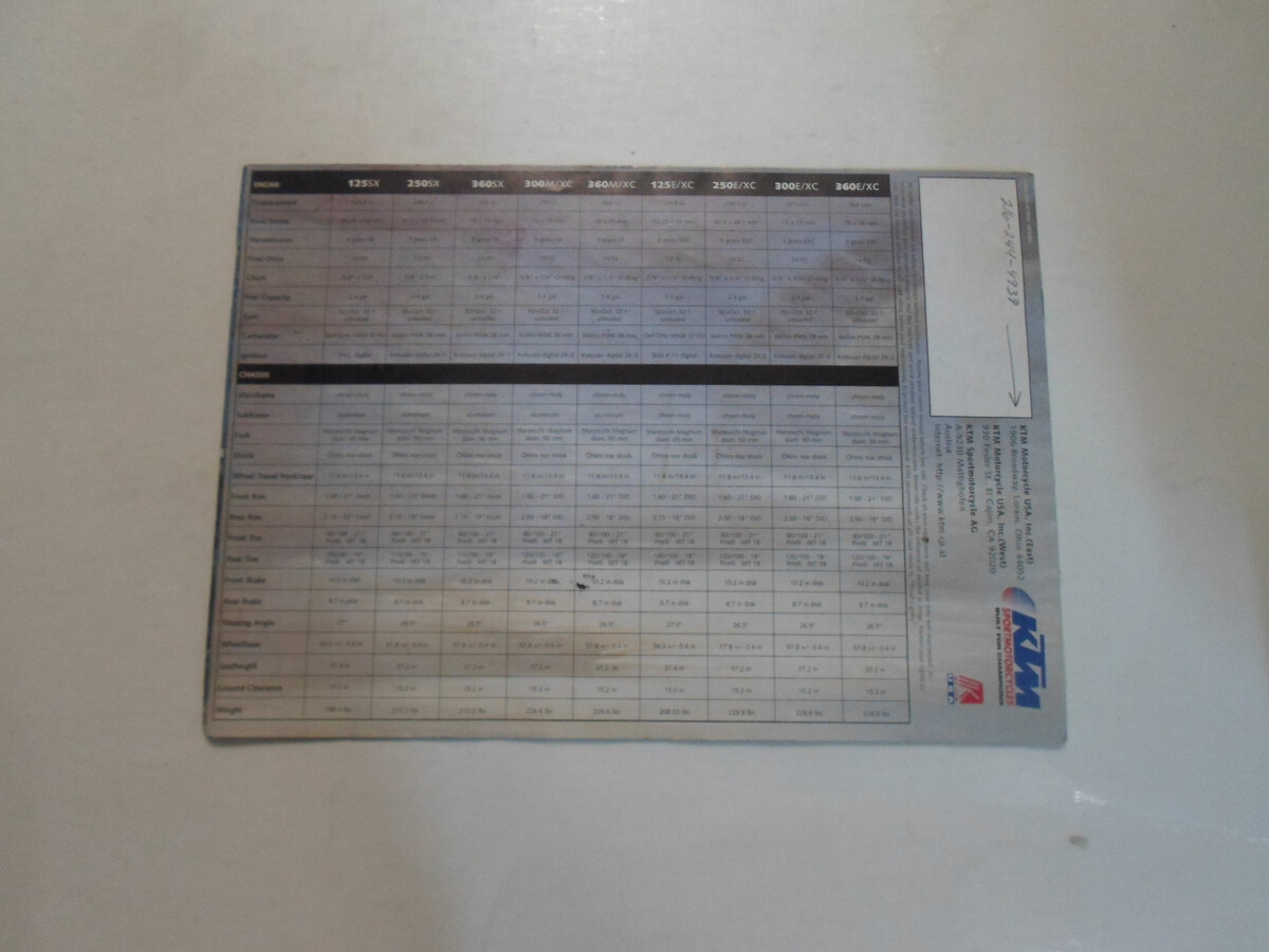 1997 TWO STROKE COLLECTION BUILT FOR CHAMPIONS SALES BROCHURE MANUAL KTM 300M XC COVERS LIMITED INFORMATION, no missing pages, great manual to have if you plan on owning a KTM. We will leave POSITIVE Feedback after we receive your payment. Please do not forget to give us POSITIVE Feedback and FIVE Stars on all of the Detailed Seller Ratings! If you are not satisfied with your shopping Experience, please contact us to get a solution before you decide to leave a NEUTRAL or a NEGATIVE Feedback, We will do our best to solve any problems for you as soon as possible. We will provide you with the BEST POSSIBLE service because the POSITIVE Feedback and FIVE Stars are what we are striving for. Please email me through "My Messages" or "Ask Seller Questions" if you have any question about our listin