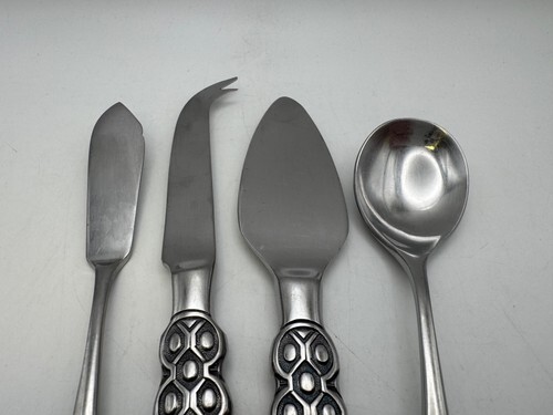 The pieces included are: master butter server (6 7/8"), cheese knife (7 3/4"), cheese server (7 3/8"), and sugar spoon (6 1/4"). They are in very good estate condition with some light wear from normal use.