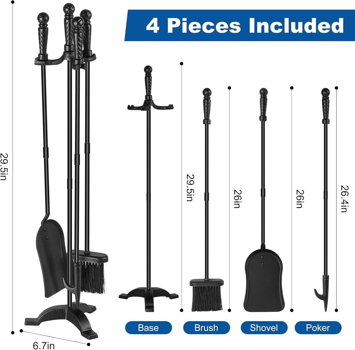 4 Pieces: Poker, Shovel, Brush, and Heavy Duty Stand
