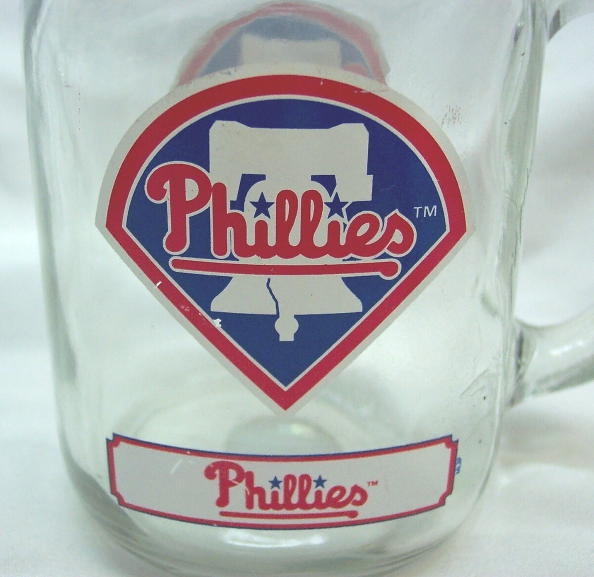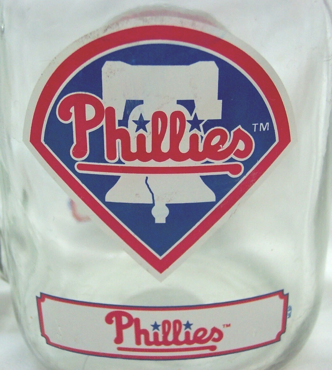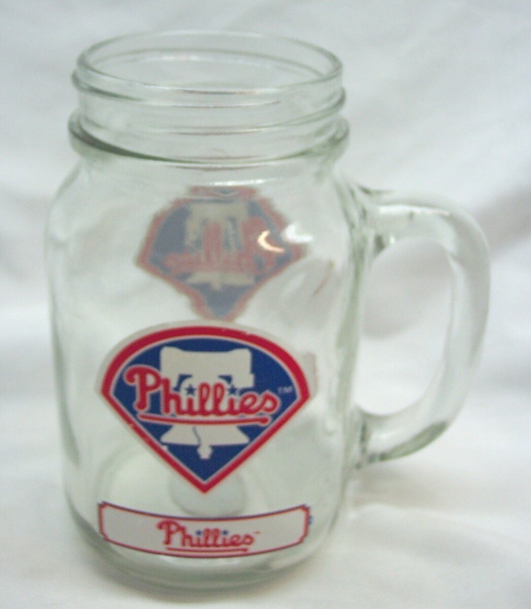 This is a PHILADELPHIA PHILLIES MLB Baseball Collector's Glass Mason Jar Cup with handle. It is in Good Condition. Print has slight wear from use. It is CLEAN! No cracks or chips. It is 5 3/4 Inches tall. Combine auctions to save on shipping. AG