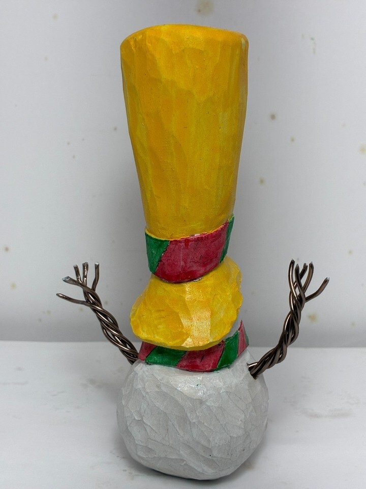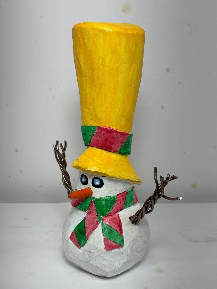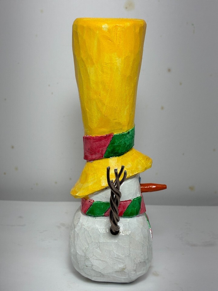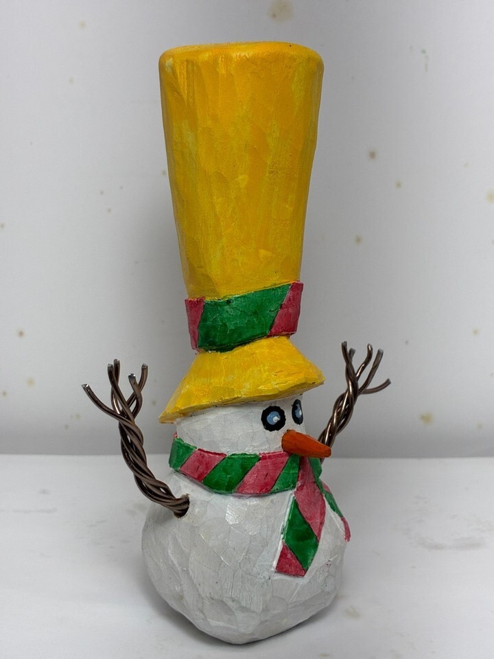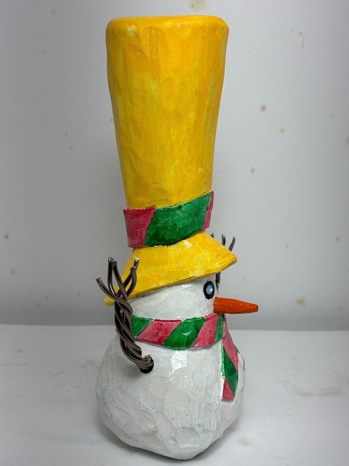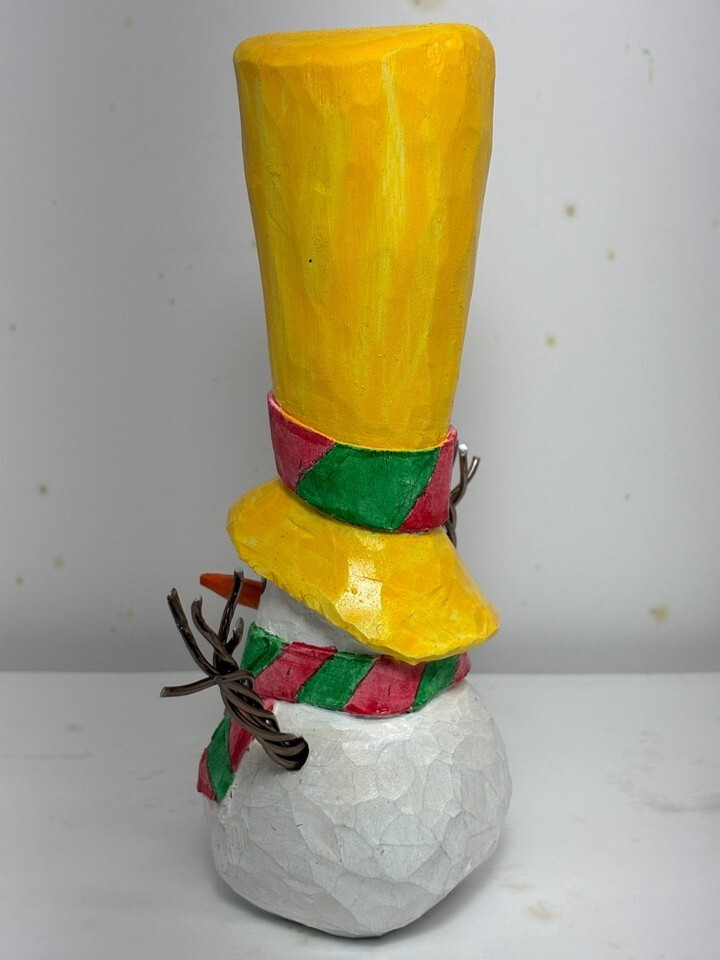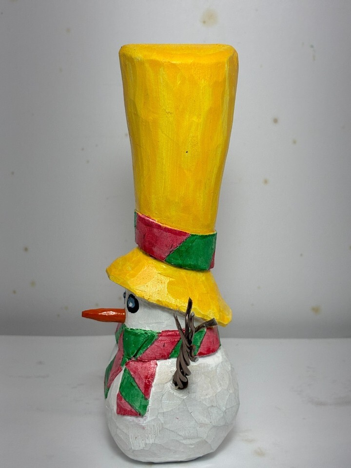 Hand Carved Large Winter Snowman with Top Hat, Scarf - Caricature Table Ornament