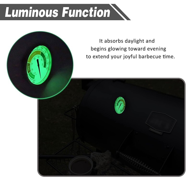 It is a luminous temperature gauge that can absorb daylight and begin glowing toward evening lets you continuously enjoy the barbecue time even in the evening.
