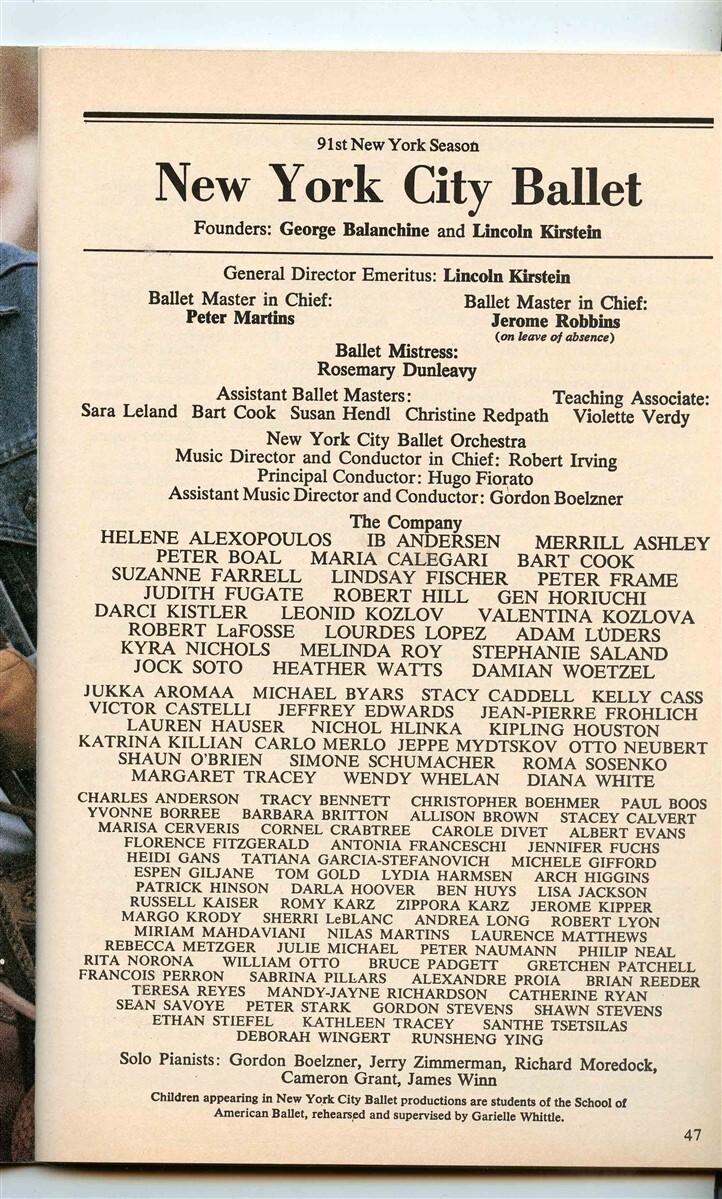 From the 91st New York Season/ Nov 21, 1989 - Feb 25 1990 at the New York Sate Theatre. New York City Ballet Program 91st Season which includes Square Dance, Sophisticated Ladies, In the Night and Vienna Waltz. 118 pages of information, photos and advertising.