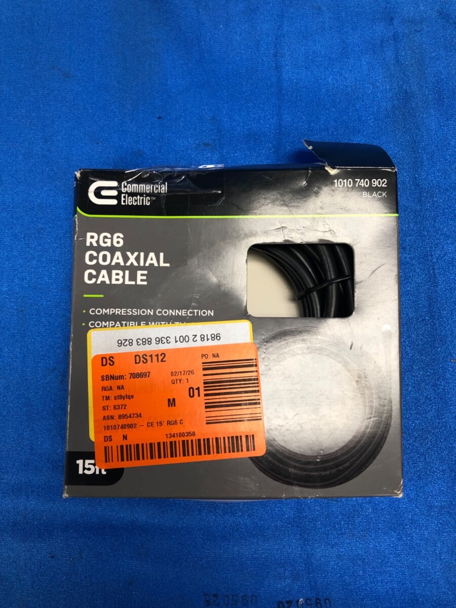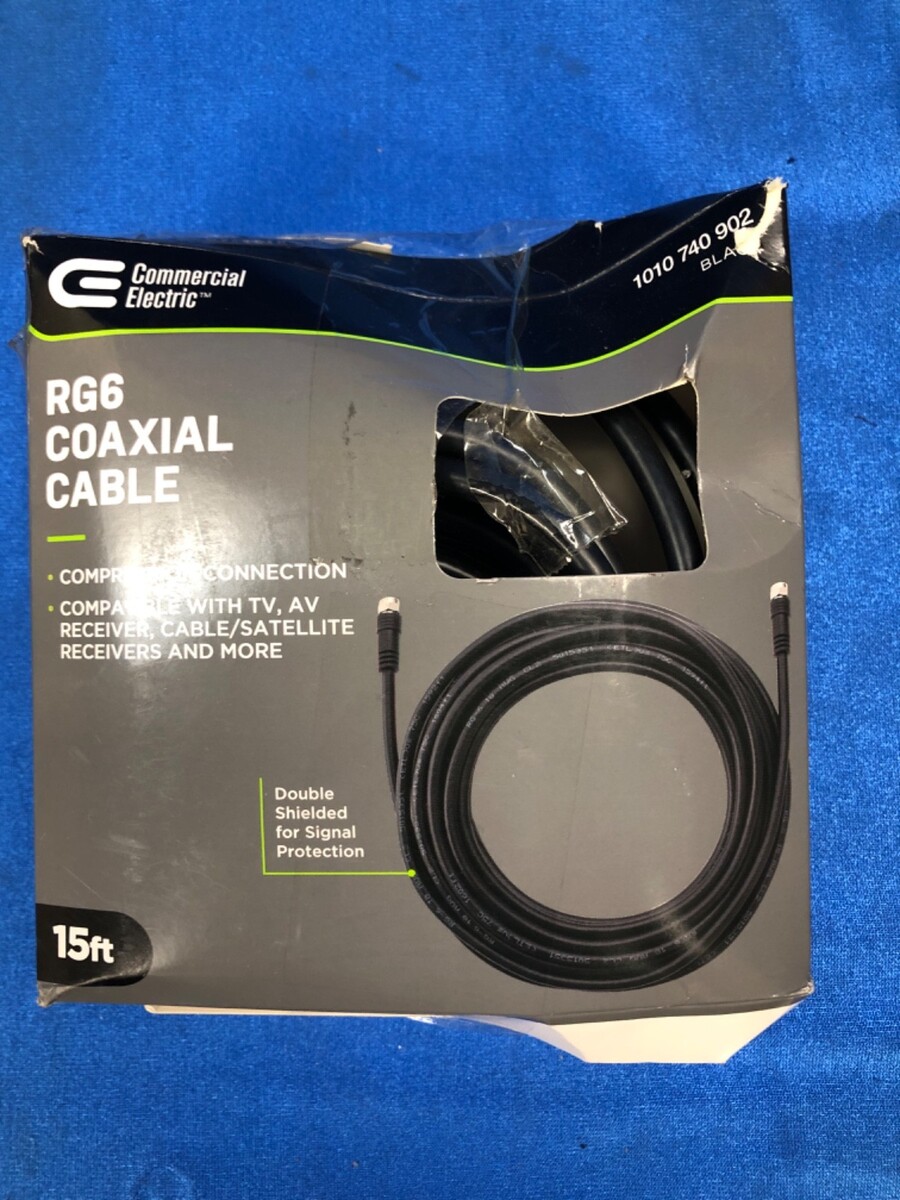 Commercial Electric RG6 Coaxial Cable 15ft Black TV Cord New