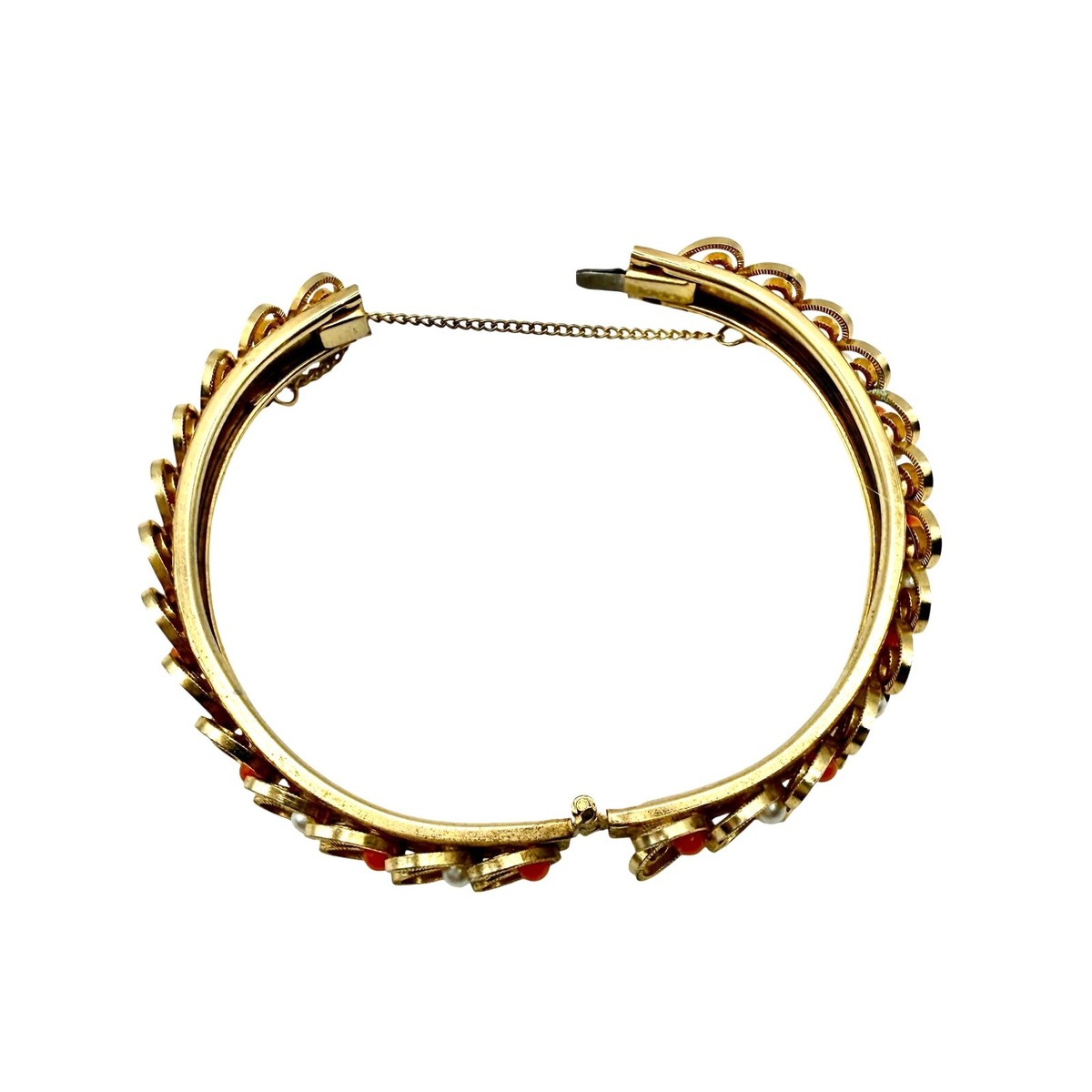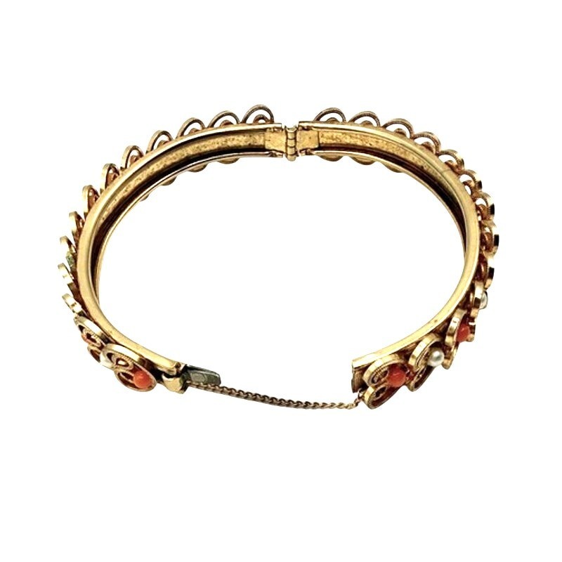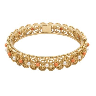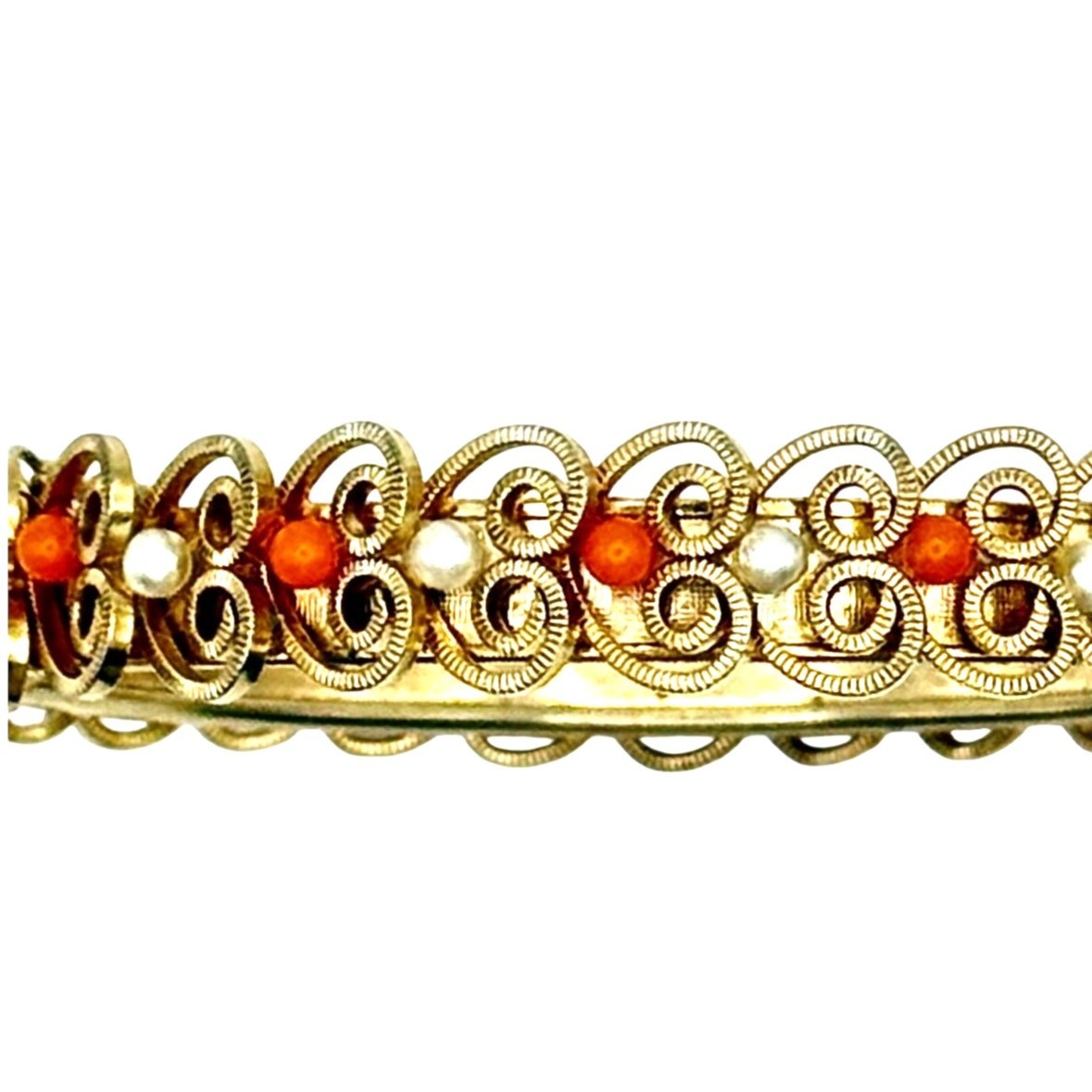VTG Mid Century Gold Tone Filigree Bangle Bracelet With Coral & Pearl Accents