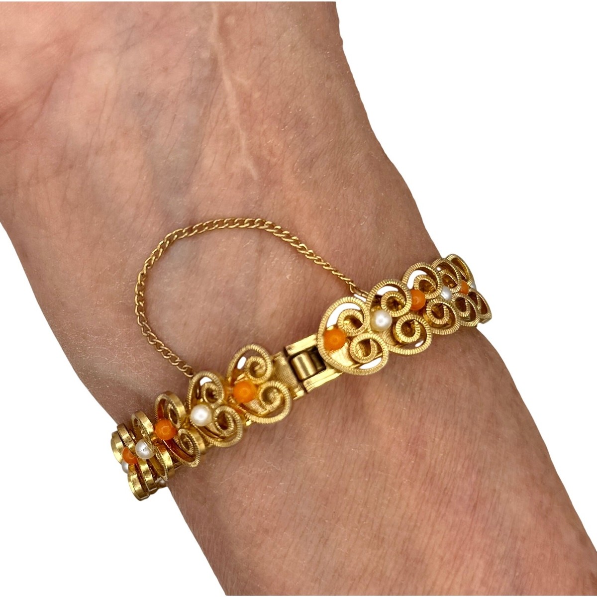 What you?ll love about this bracelet is the exquisite mid-century filigree craftsmanship?ornate gold-tone scrollwork punctuated with warm coral beads and luminous faux pearls. The design delivers unmistakable romantic, old-world elegance with a touch of bohemian glamour, evoking heirloom jewelry from a more glamorous era.
