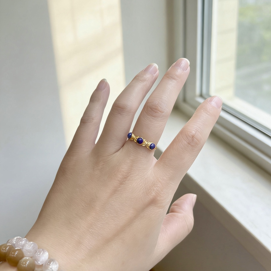 925 Silver Gold Plated Lapis Lazuli Triple Stone Ring 4mm Adjustable Boho