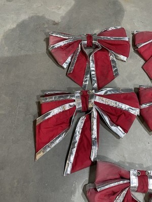 I am selling on behalf of the owner a set of 5 municipal Christmas decorations commercial quality Christmas bows. All the bows are dusty and most are somewhat faded on one side. Each have 2 metal grommets to hang with. Measures 24? by 24?. New comparable bows sell online around $75.00 to $100.00 each. Sold as shown.