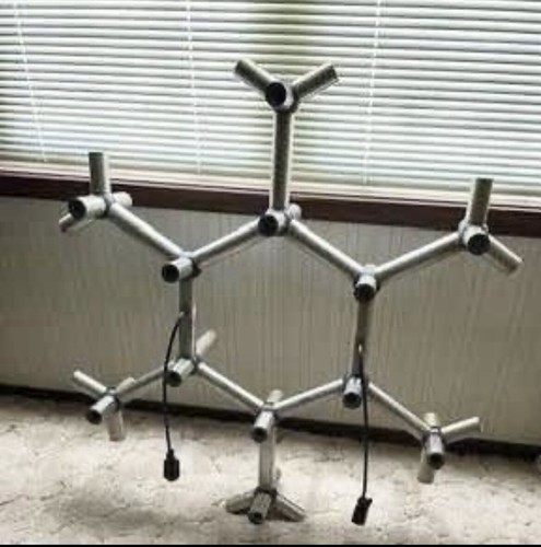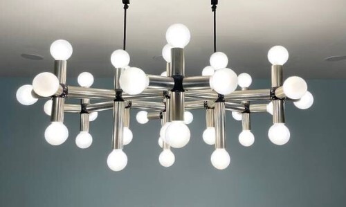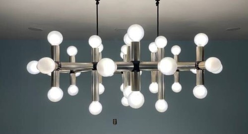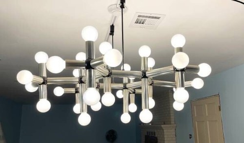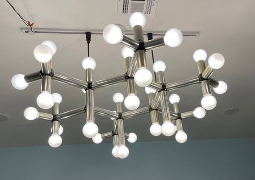 For sale is a contemporary 36 light vintage 1970?s Molecule chandelier we believe was designed by either Robert Haussmann or Robert Sonneman perhaps for the Lightolier company. This chandelier is not labeled Lightolier, except for the 2 original track connectors that now have been replaced with a newer connector. The 2 original Lightolier connectors shown in the last photo, are also included. The light has 36 regular sized socket bulbs. Bulbs also included.