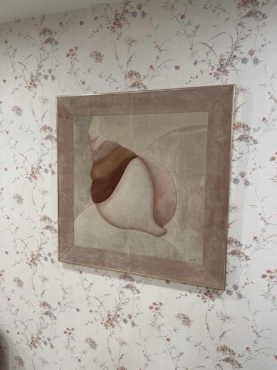 I am selling on behalf of the owner a stunning vintage Mid Century Contemporary large suede wall art painting in a gold metal frame of a seashell. Measures 37? wide and 37? tall. There is no major damage, just normal signs of wear.