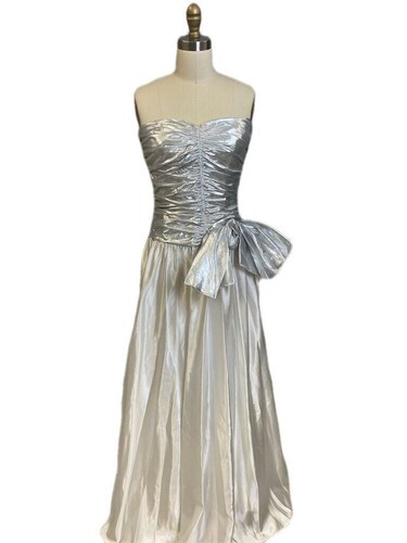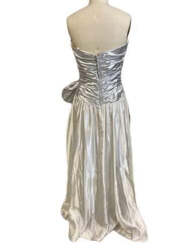 Acetate satin in white; metallic silver ruched strapless bodice with bow; boned interior; nylon back zipper; NWT with paper tags intact.