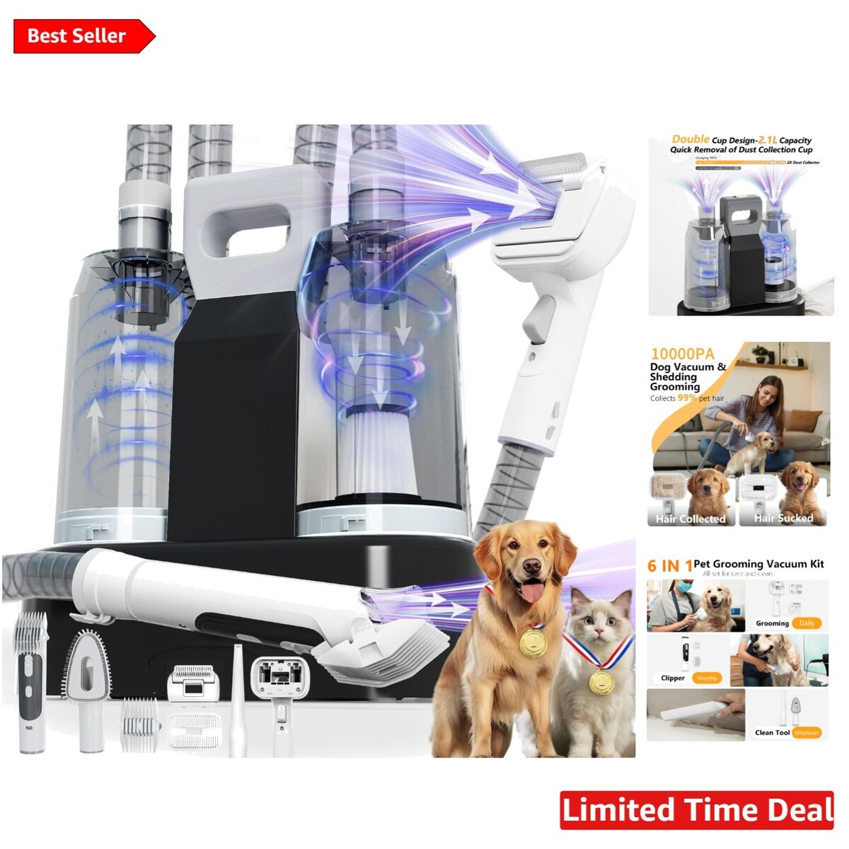 Features: Low Noise,Vacuum System,Grooming Combs,Hair Trimmer,Blow-Drying,Suction,6 in 1 functionality,2.1L double dust cup,5 FT hoses,Removes 99% of pet hair,Operates at less than 60 dB,Ideal for pet owners,3- after-sale service