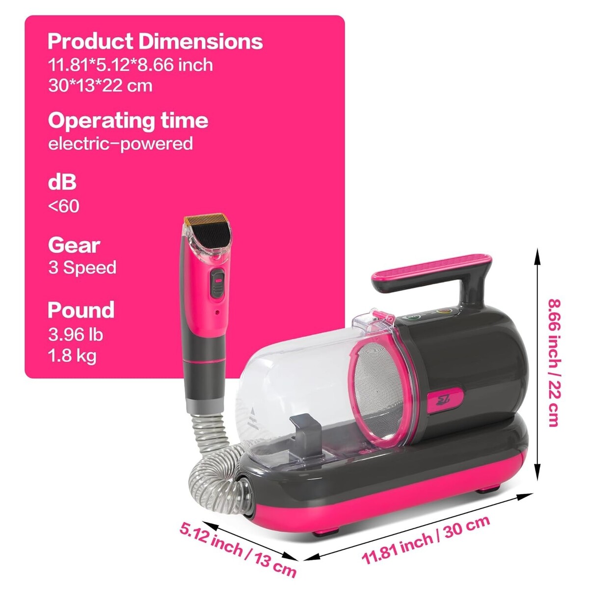 Easy to Clean: Equipped with powerful suction, the vacuum's large capacity dust container ensures effortless cleanup after each grooming session.