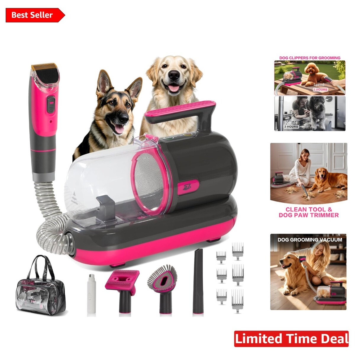Features: High-Suction,Low Noise Design,Easy to Clean and Maintain,Compact Hair Collection System,Multi-Purpose Grooming,Mess-Free Cleaning,Removes Loose Pet Hair while Brushing,Designed for Indoor Use,Helps Reduce Stress for Pets,Complete Grooming Vacuum Kit,Includes Grooming Brush,Includes Deshedding Tool,Includes Electric Clippers,Includes Multiple Guide Combs,Includes Nail Grinder,Powerful Suction,Large Capacity Dust Container,Simple to Empty Dust Container