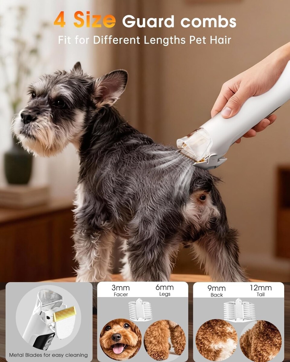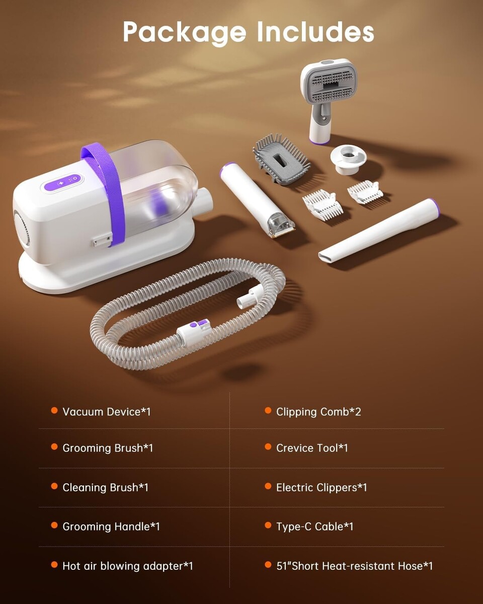 Features: Dog Grooming Vacuum,Blow Dryer Function,Dust Box,Grooming Brush,Deshedding Tool,Dog Grooming Clippers,Cleaning Brush,Nozzle,Adjustable Suction Levels,Low Noise Design,Detachable Design,Large Capacity Dust Cup,6 in 1,99% Pet Hair Removal,Home Grooming Kit,Easy to Use,Professional Pet Salon at Home,Strong Suction Power,Tidy Hairless Home,3 Adjustable Suction Levels,Comfort for Pets,4.9FT Extended Hose,8.17FT Power Cord,Sensitive Pets Friendly,Large Dust Cup