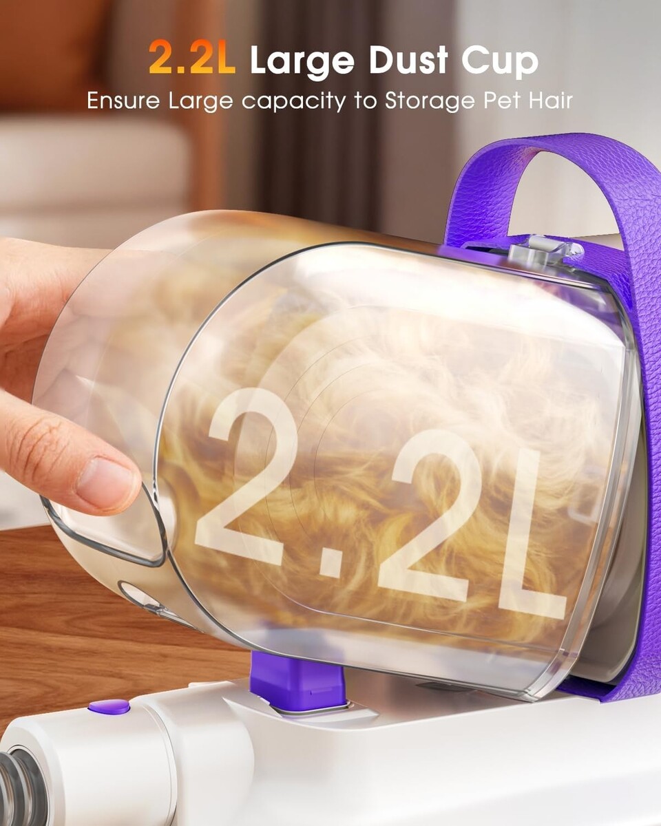 Thoughtful Design Features: The 4.9FT (1.5m) extended hose and 8.17FT (2.5m) power cord ensure flexibility, letting you all corners while minimizing noise to keep sensitive pets calm. A 2.2L dust cup means less frequent emptying, making grooming more efficient.