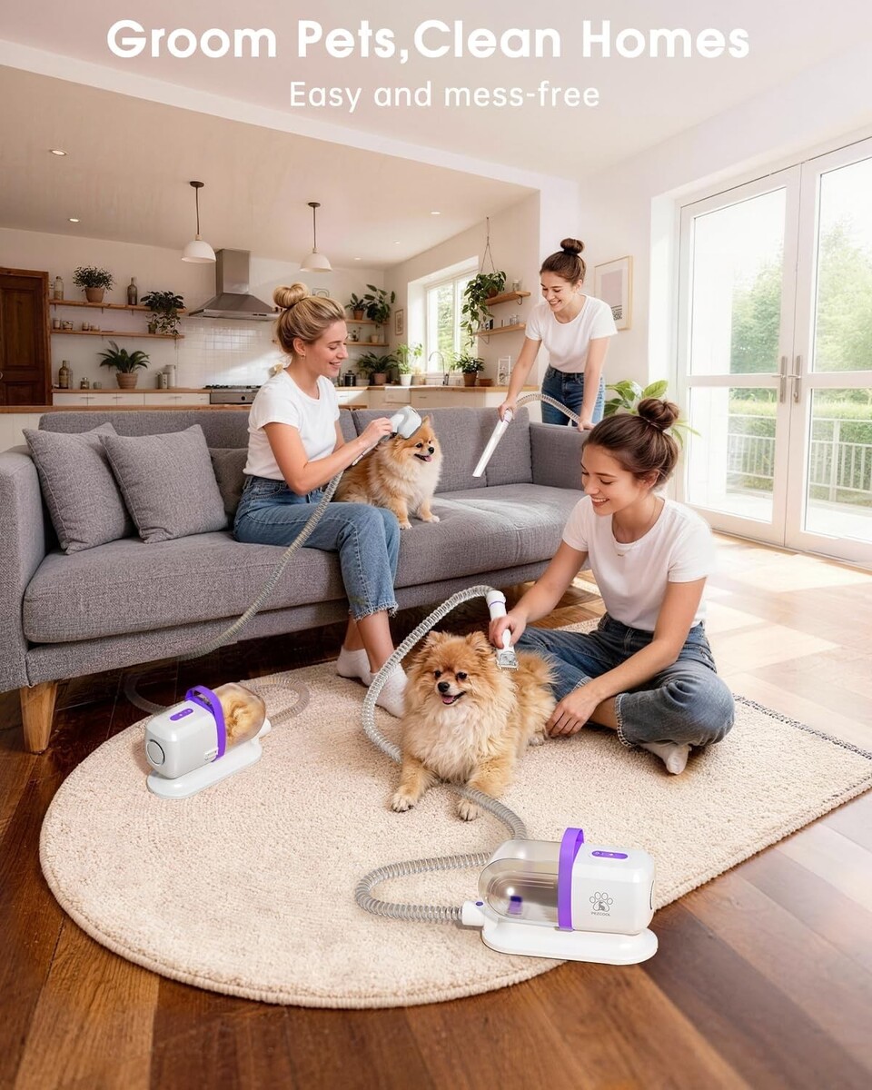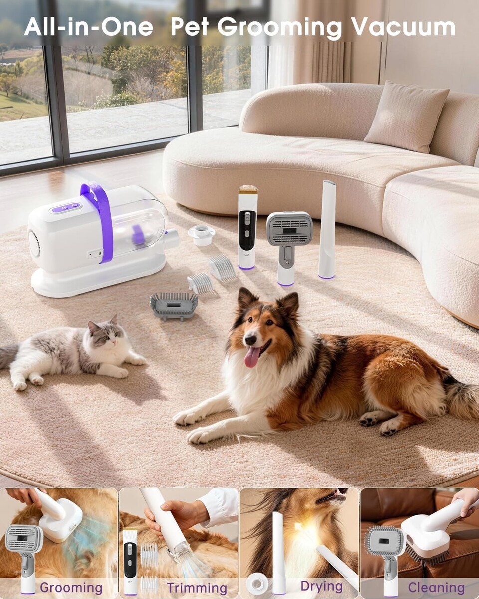 Comprehensive Grooming Attachments: Comes equipped with 6 essential tools including a grooming brush, deshedding tool, dog clippers for haircuts, and cleaning nozzles for furniture and floors.