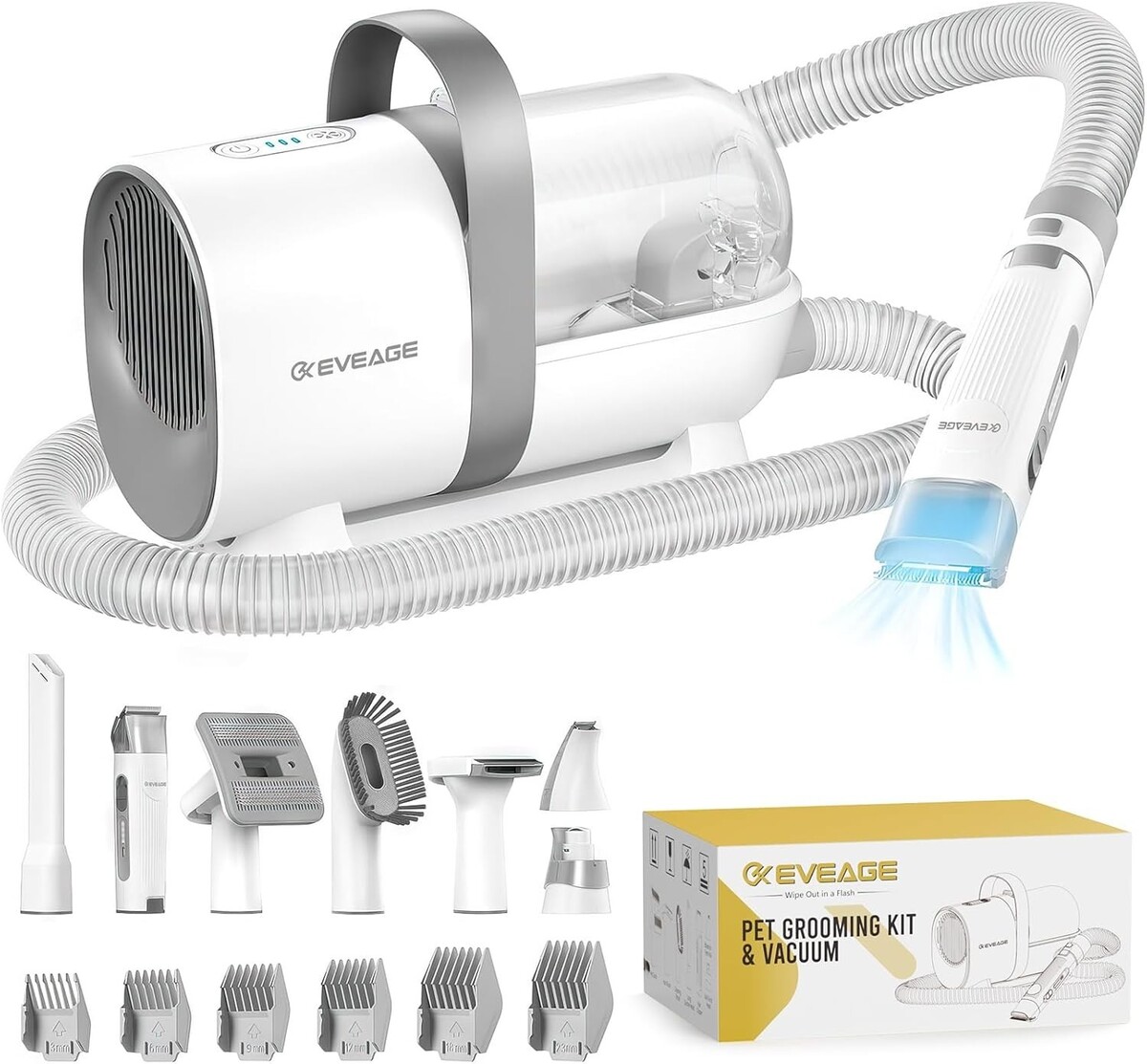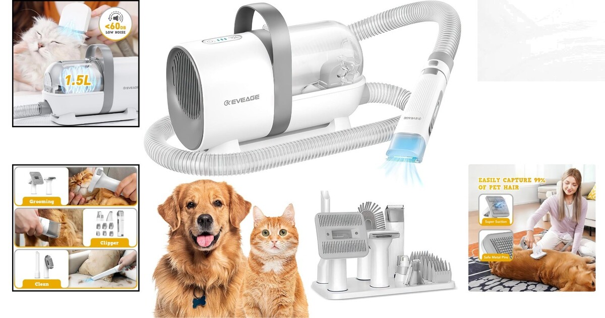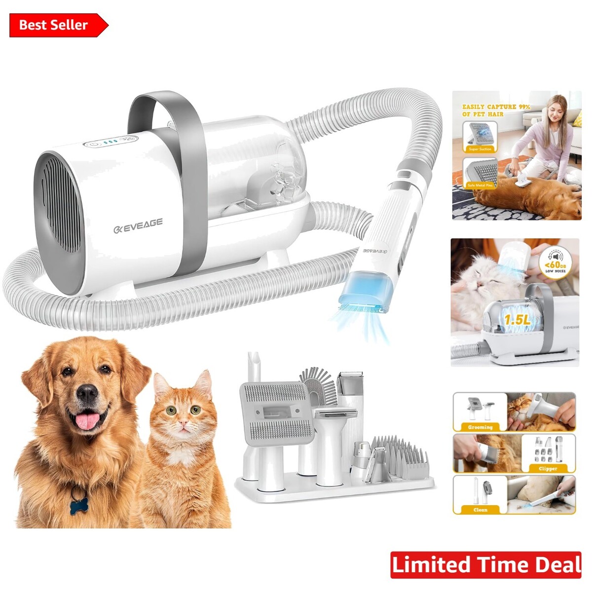 Features: Cordless,Low Noise,Easy Empty Dustbin,Adjustable Suction Levels,Detachable Head,Storage Boards and Bags,Adjustable Trimming Combs,Grooming and Vacuuming All at Once,Collects 99% of Pet Hair,Easy to Use for Novices,Noise Level of 60 dB,Space-Saving Design,1.5L Dust Box,Quick and Mess-Free Emptying,Grooming Brush,Deshedding Tool,Electric Clipper,Dog Paw Trimmer,Dog Nail Grinder,Nozzle Head,Cleaning Brush,Suitable for All Hair Types,Unisex Target Audience