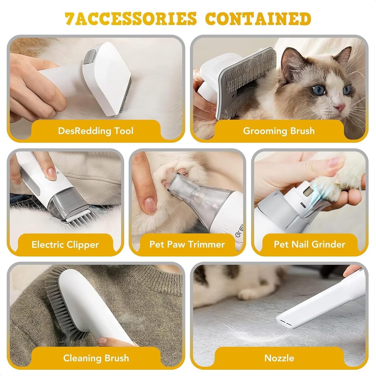 7 in 1 Pro Pet Grooming Kit: This comprehensive kit includes a grooming brush, deshedding tool, electric clippers, paw trimmer, nail grinder, and cleaning brushes for maintaining a tidy home.