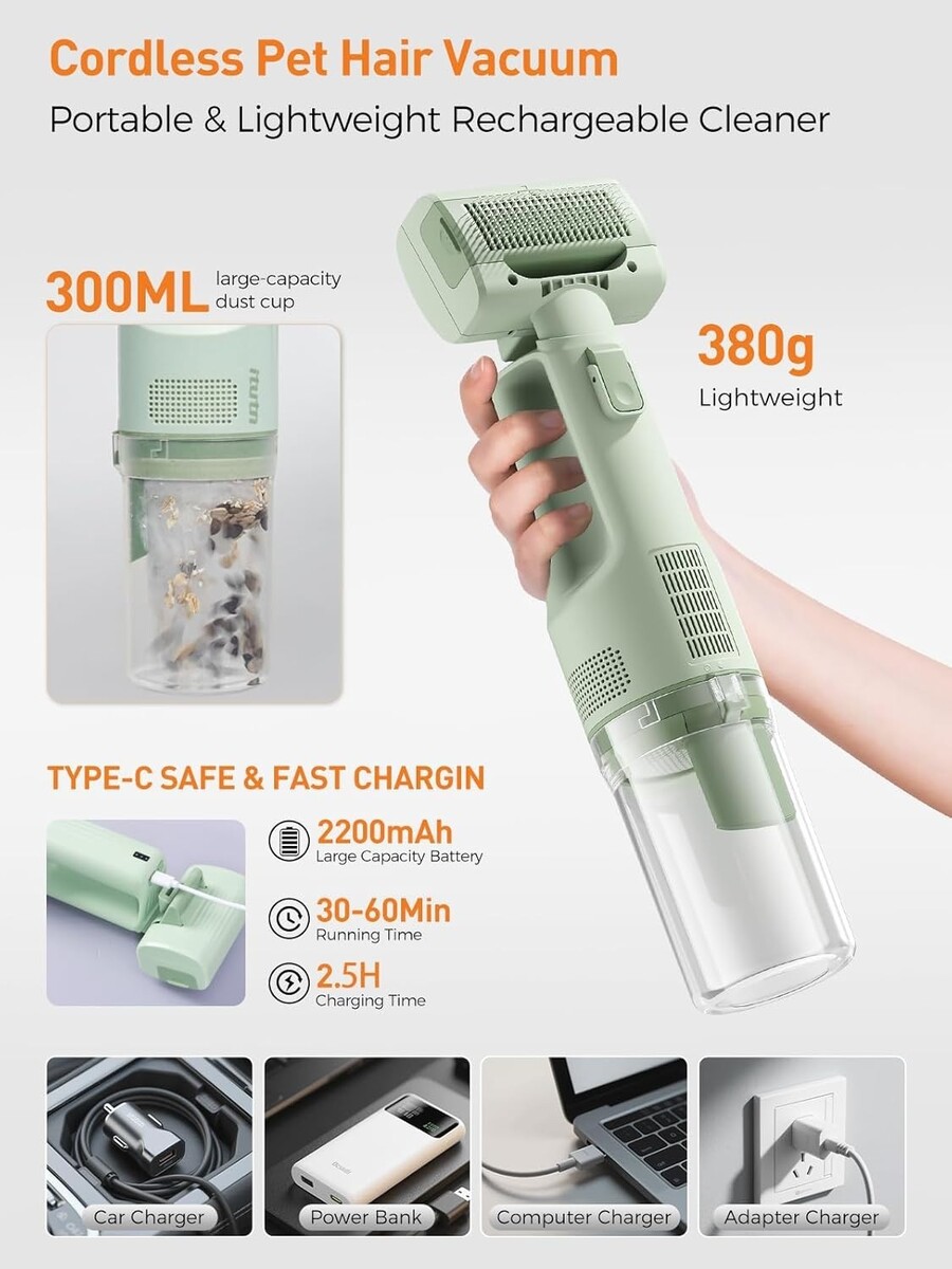 Features: Cordless,Rechargeable,Lightweight,Low Noise,Adjustable Suction Levels,One-Touch Pet Hair Removal,Portable,Multi-functional,Brush and Clean Hair,2-in-1 Pet Grooming Vacuum,10KPa Suction Power,Integrated Vacuum,Three Adjustable Suction Levels,One-Handed Operation,Easy to Use,Multi-scene Home Use,Dustbin,Mini Vacuum,Long Suction Nozzle,Detangling Comb,Slicker Brush,Hair Removal Brush,Deshedding Brush