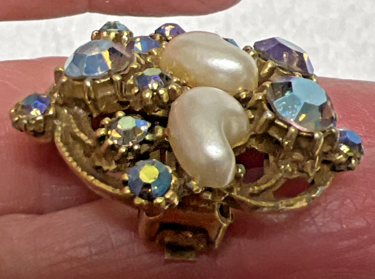 Vintage Florenza Clip Earrings Pearl w Blue Watermelon Rhinestone 1 1/8"
