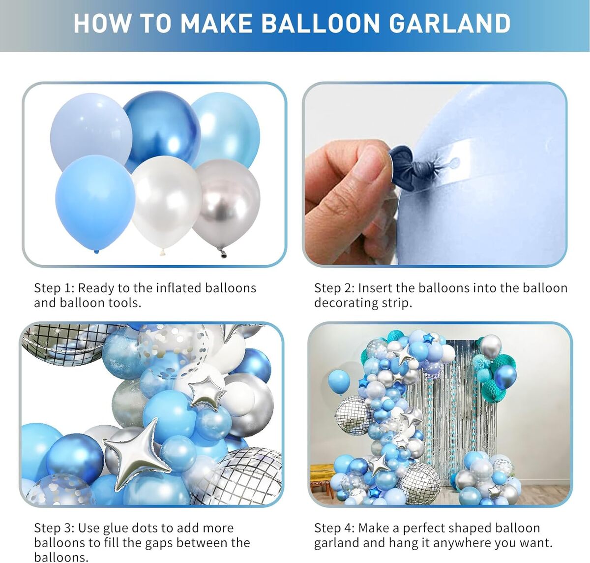 Inflate with air or helium and use the included balloon strips and glue dots to effortlessly create garlands, arches, or wreaths. Simply slide the balloon knots into the strips and design your favorite shapes in minutes, adding a professional touch to your celebration.