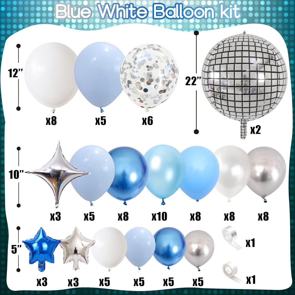 10-inch Balloons – Pearl Light Blue 10, Metallic Blue 8, Silver 8, Pearl White 8, Macaron Blue 5, Light Blue 8