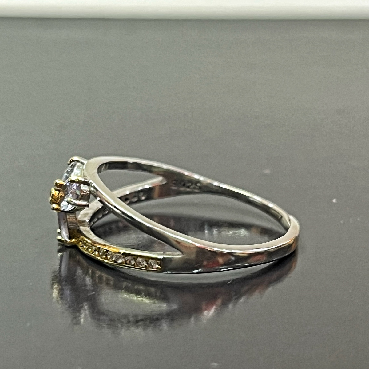 complement the violet-blue stones. The split band
