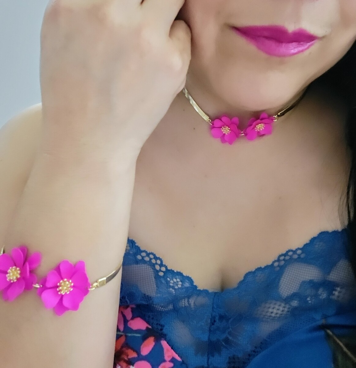 Bracelet: Complements the necklace with matching pink flowers.