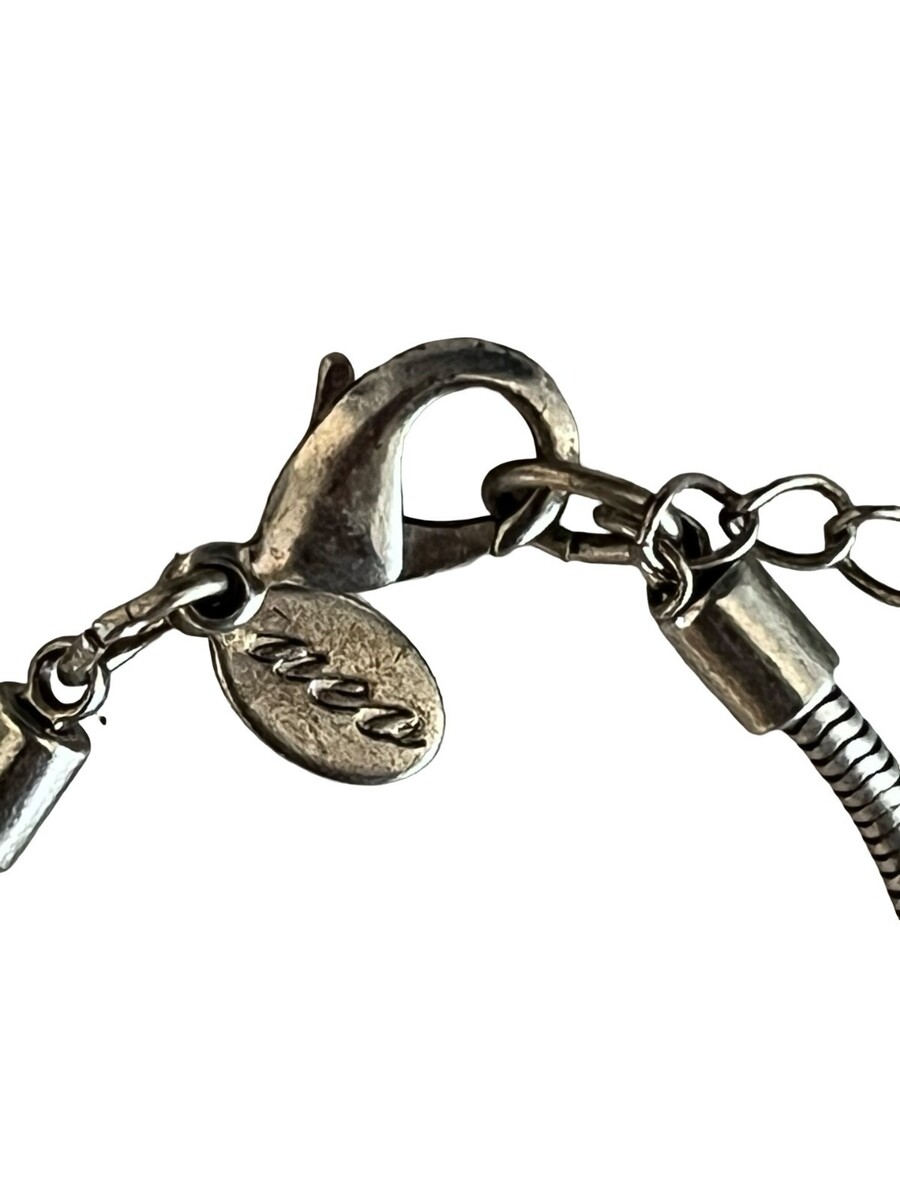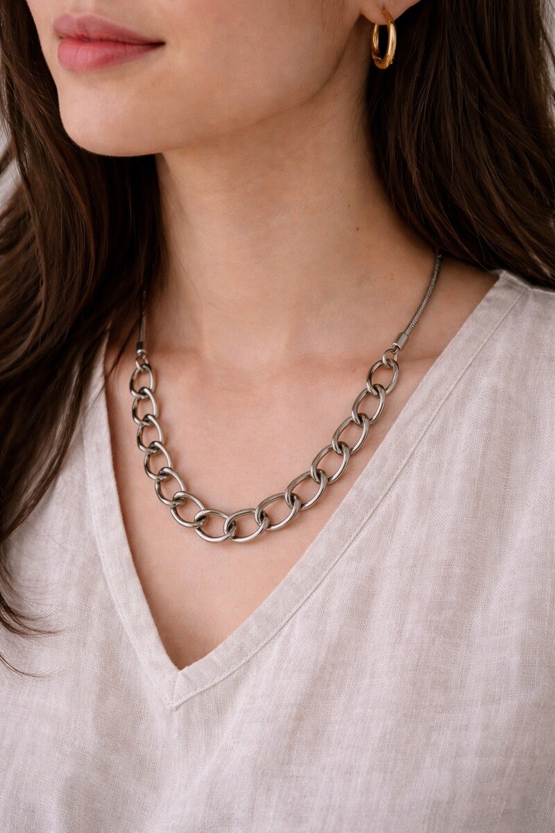 Stylish vintage American Eagle Outfitters necklace featuring a unique mixed-chain design. The top half is a sleek snake chain, transitioning into bold oversized oval links for a modern statement look. Finished in a silver tone with an adjustable extender and AEO tag, this piece blends minimalist and edgy Y2K style perfectly.