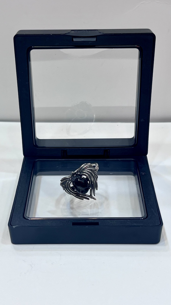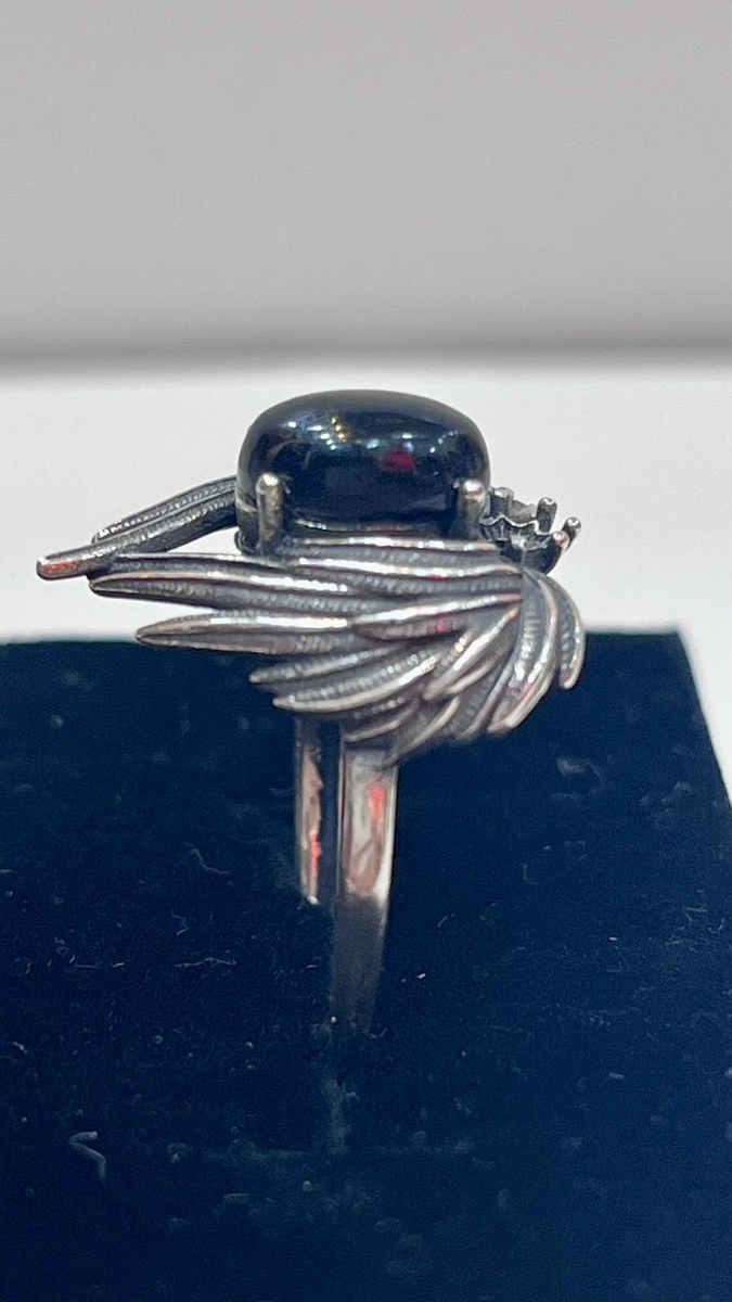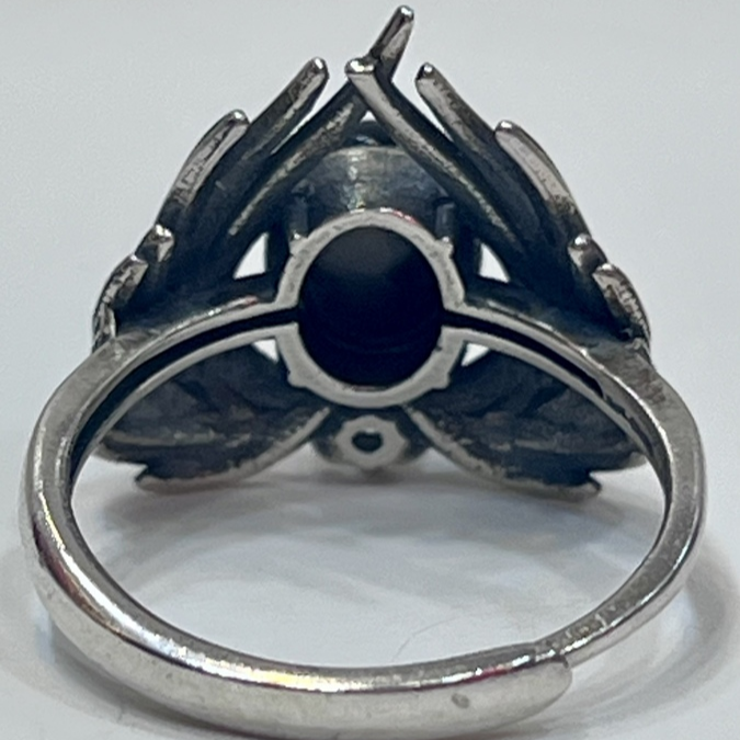 925 Silver Gothic Wing Black Stone Ring 7x9mm Oxidized Adjustable Dark Boho